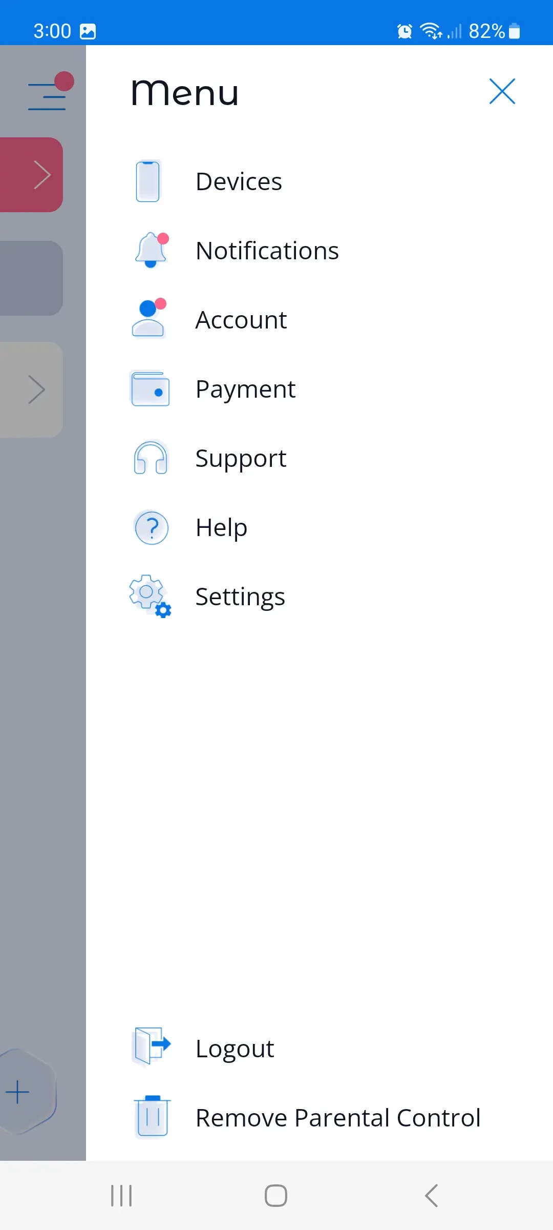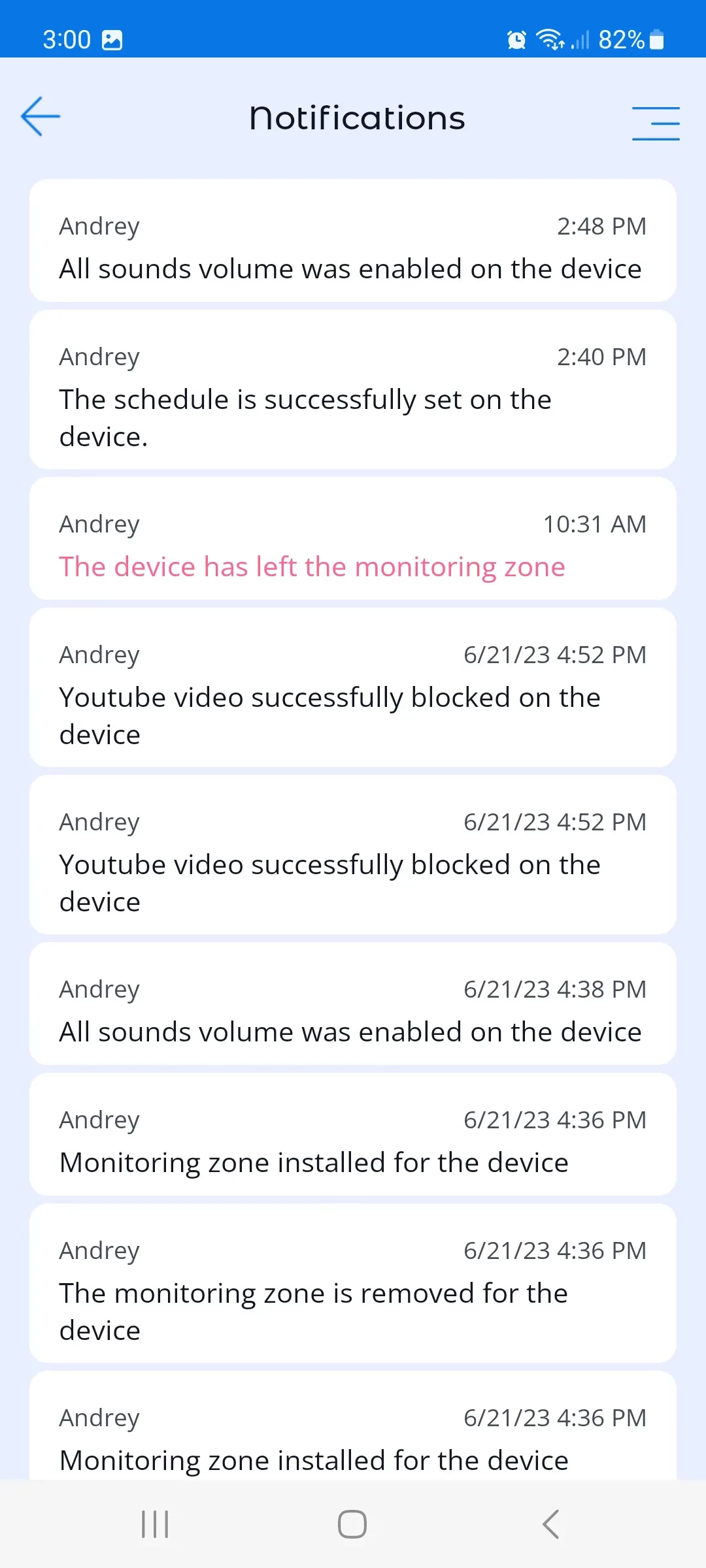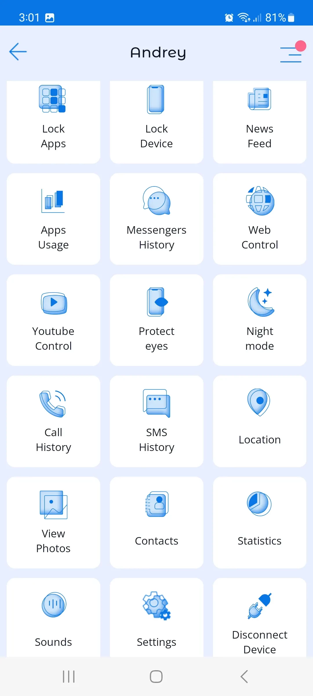 1. List of connected children's devices for further management. When tapping on a device in the device list, the user is taken to the control menu of that device, where all the functions available in the app are listed.