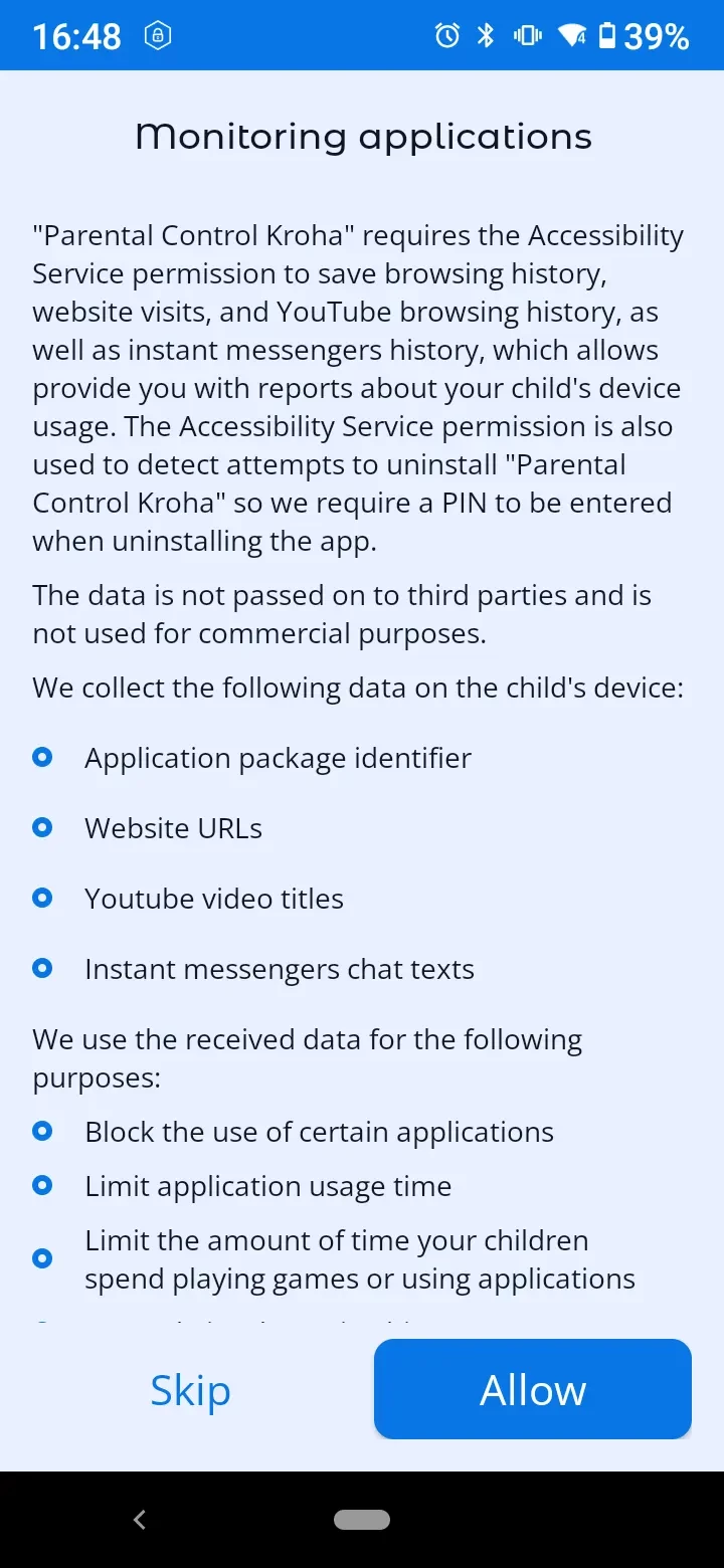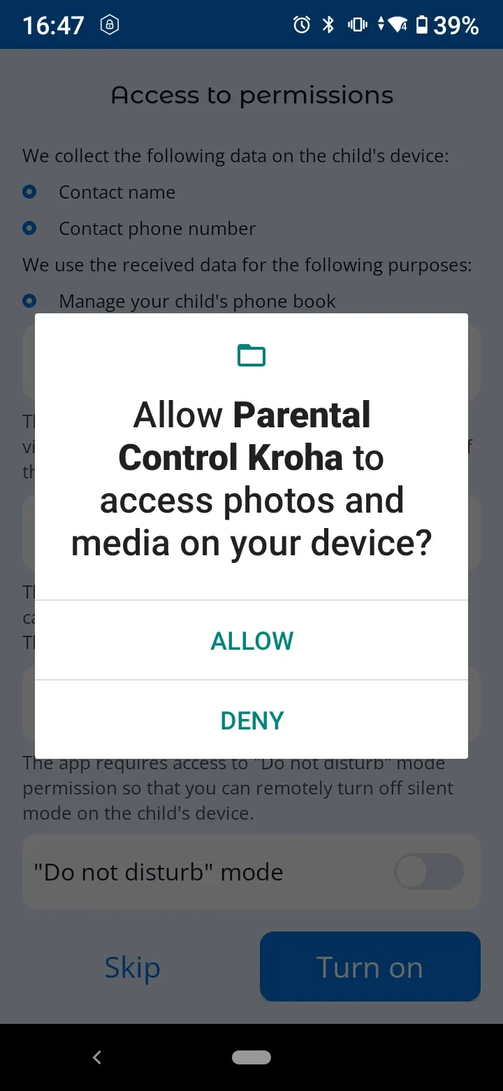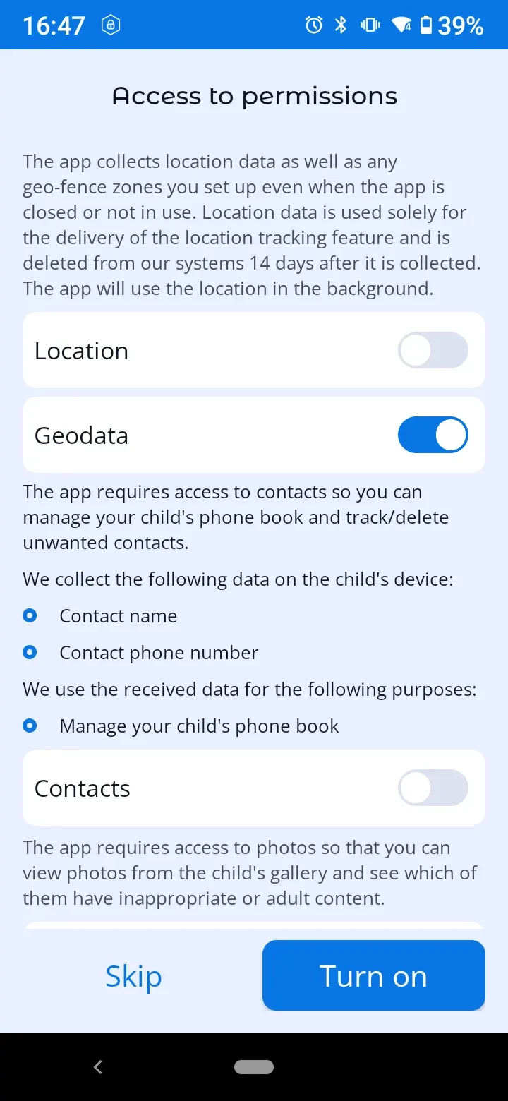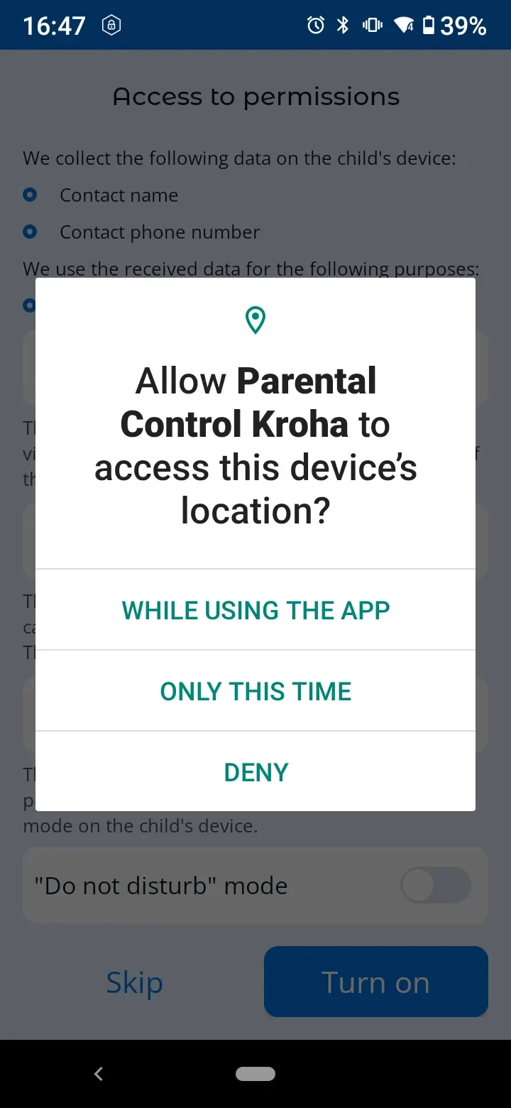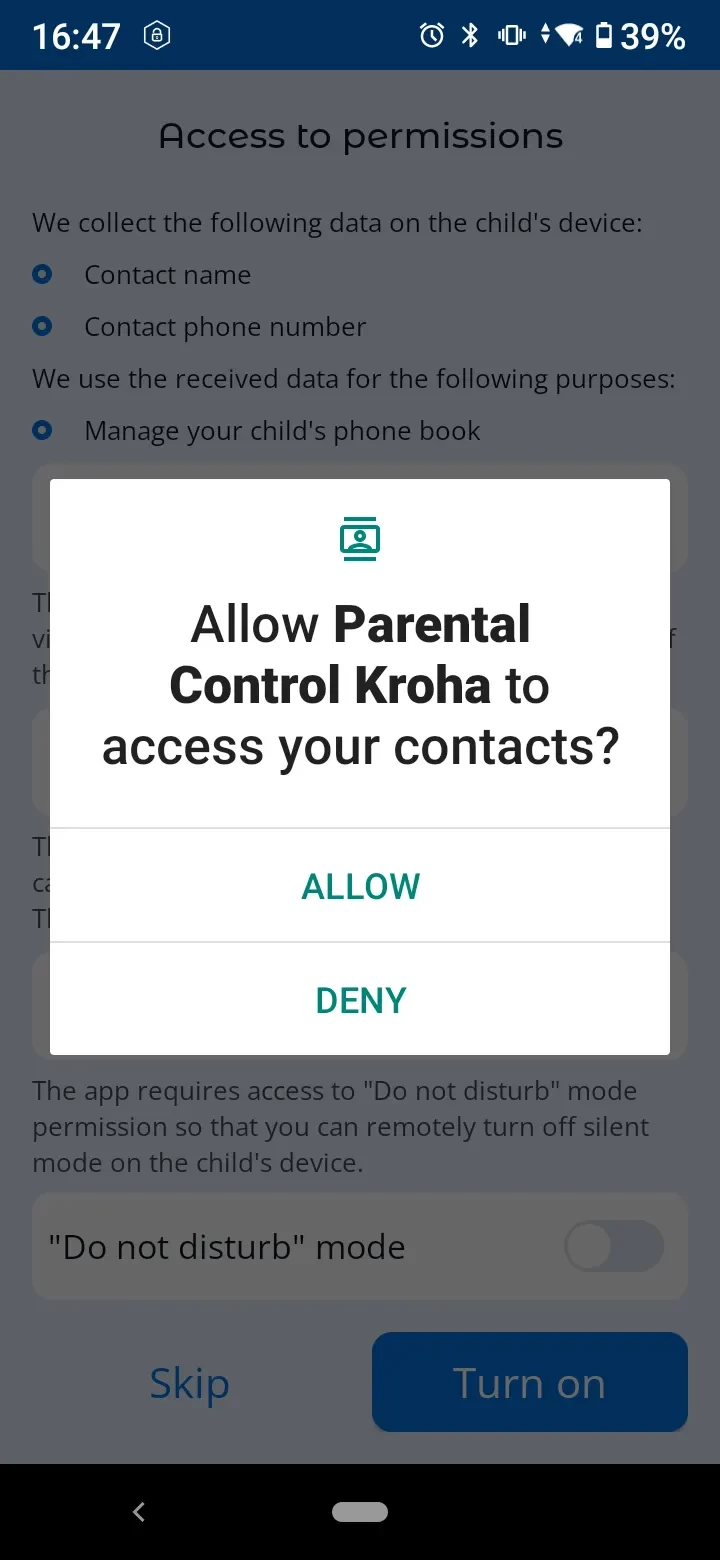 In order for the app to work properly, you need to set permissions when connecting your child's device to your account.
