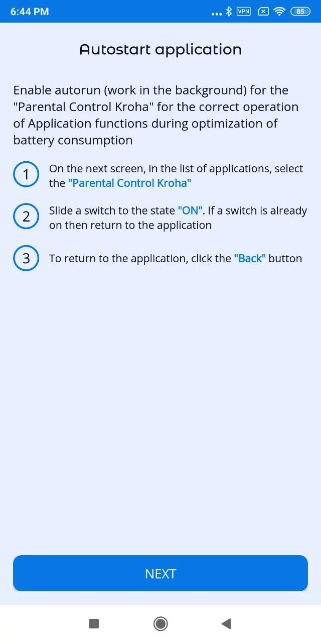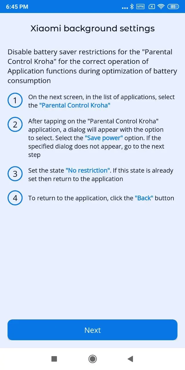 - “Battery Optimization”, for the correct operation of the app you need to disable battery optimization for Kroha Parental Control app, read the step-by-step guide for details and tap “Next”;