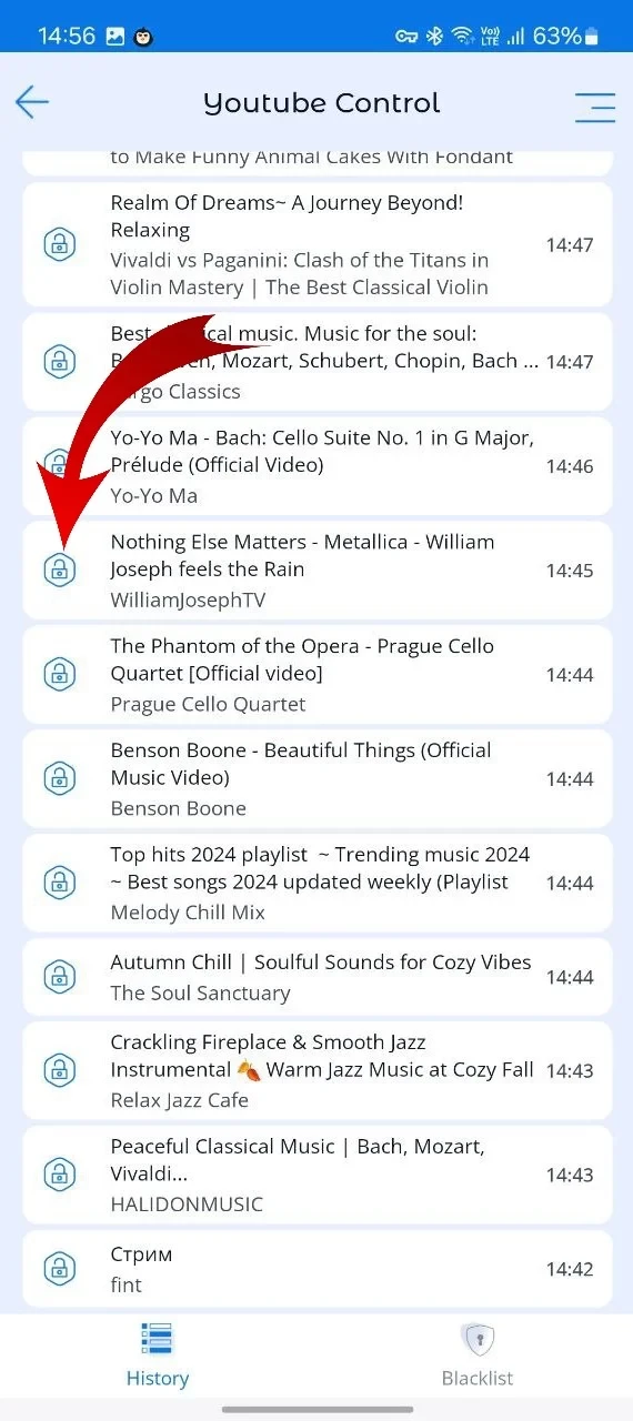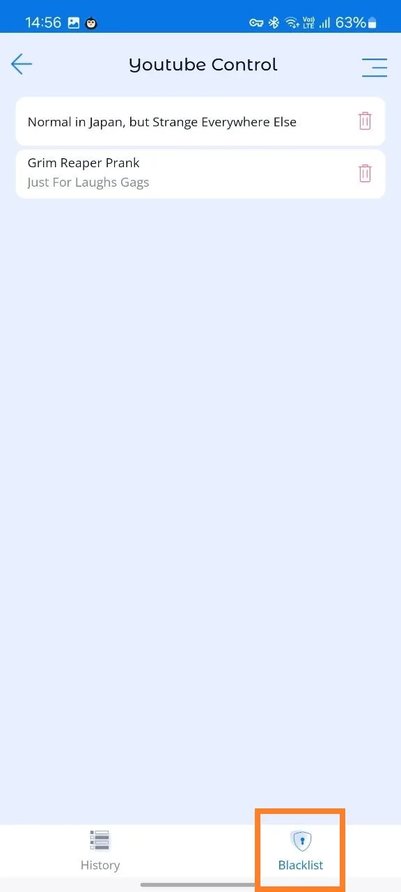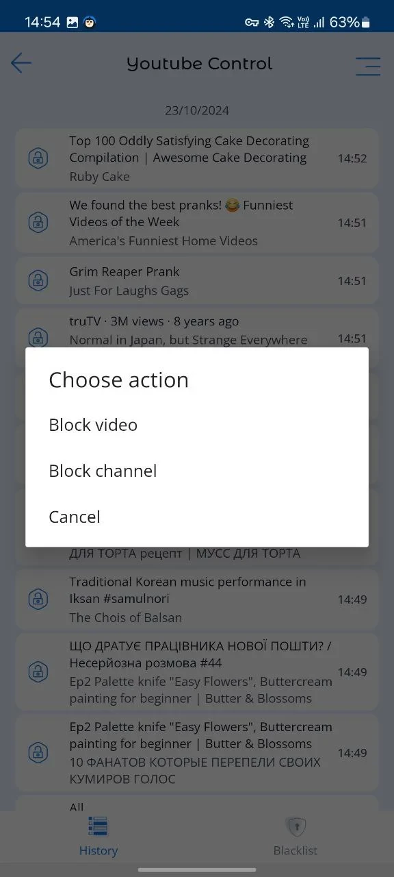 The history of YouTube videos viewed by the child. Blocking of unwanted video or YouTube channel, the option of creating a blacklist.