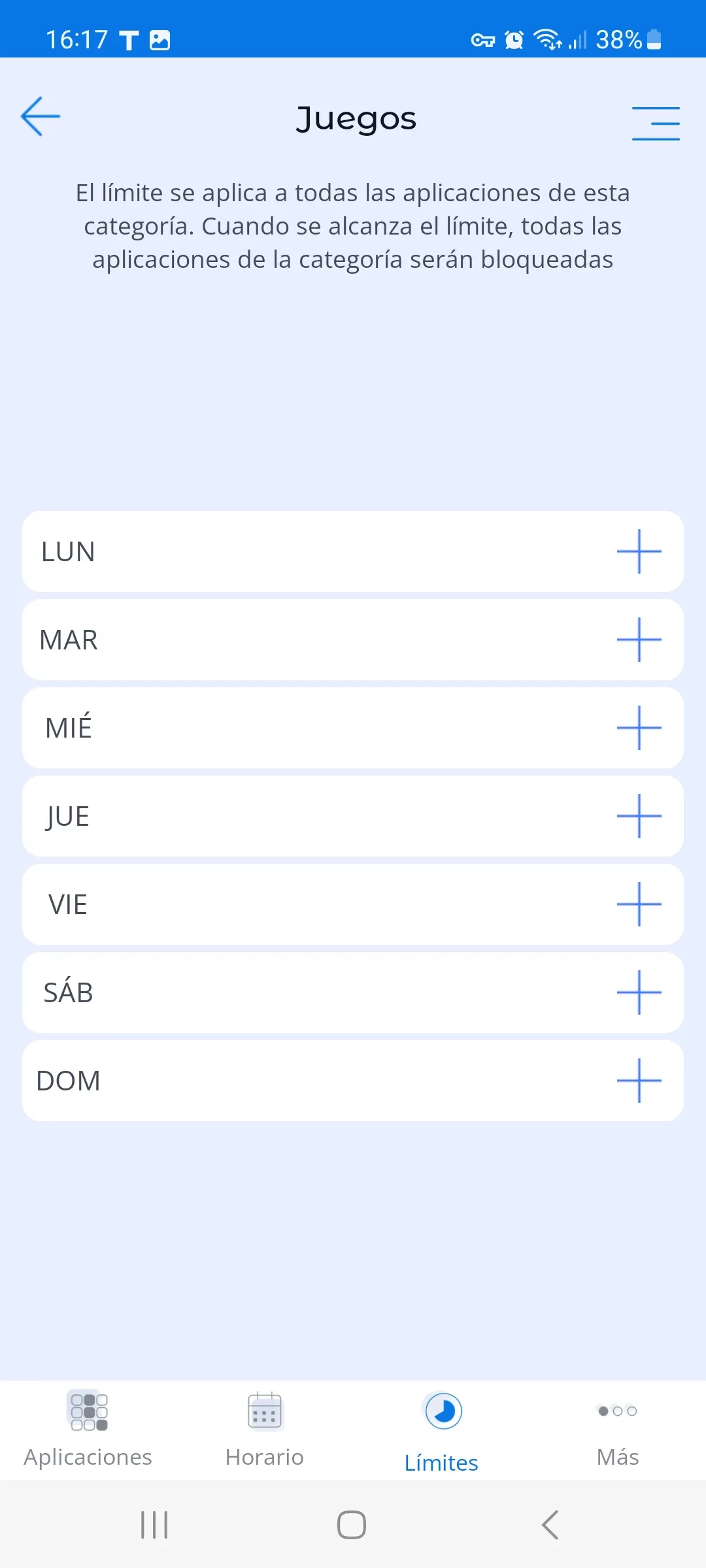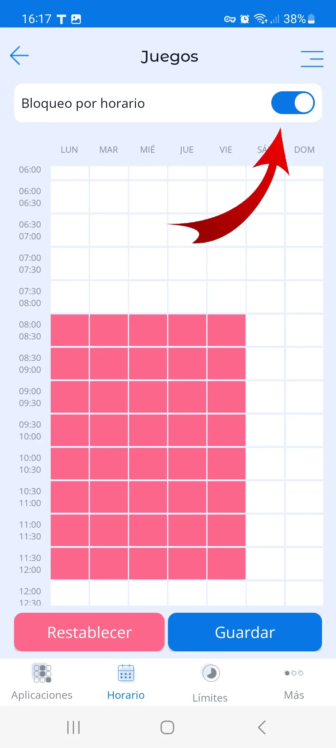 - Establecer un horario diario o semanal para bloquear grupos de aplicaciones, por ejemplo, durante el horario escolar