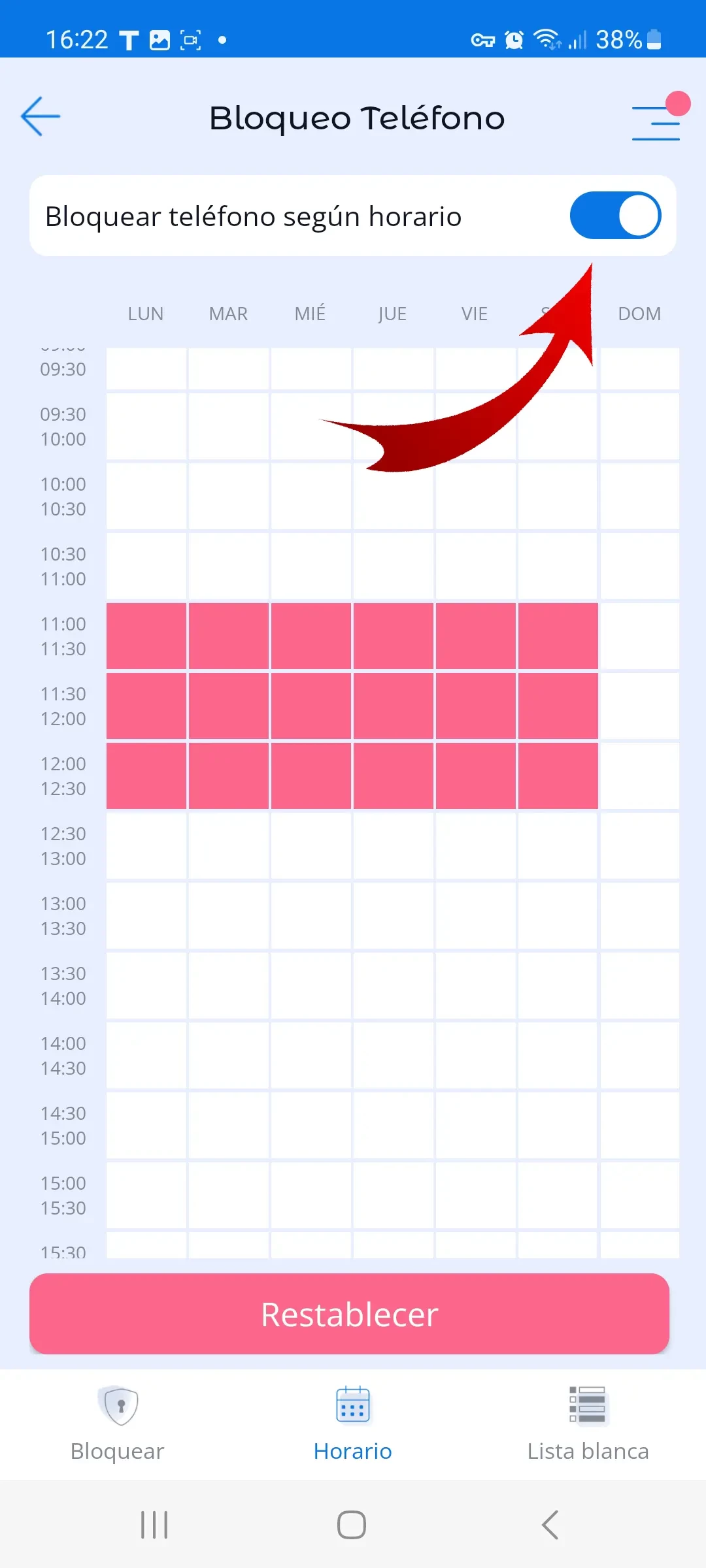 Para bloquear un intervalo de tiempo determinado, debe presionar la celda correspondiente al inicio del período y deslizar hasta la celda deseada al final del intervalo de tiempo. Luego, active la función en la esquina superior derecha del menú Horario. Las celdas rojas indican que el teléfono inteligente del niño estará bloqueado durante este intervalo.