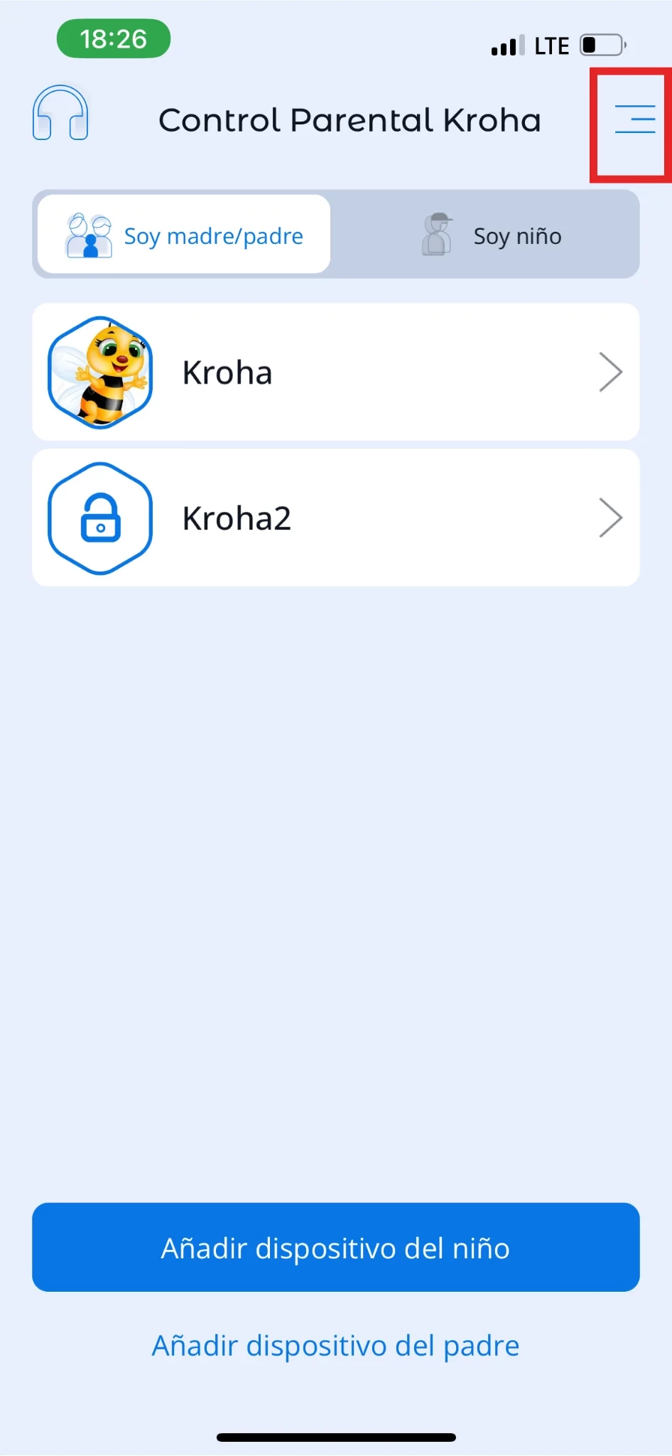 Para abrir el menú adicional (menú lateral), necesitas abrir la app Kroha de controles parentales, tocar el icono de menú (tres barras) en la esquina superior derecha y ir a “Configuración”.
