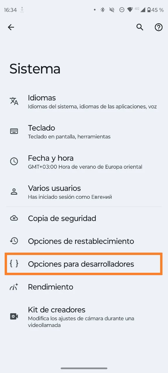 Luego, para ir a las opciones de desarrollador: