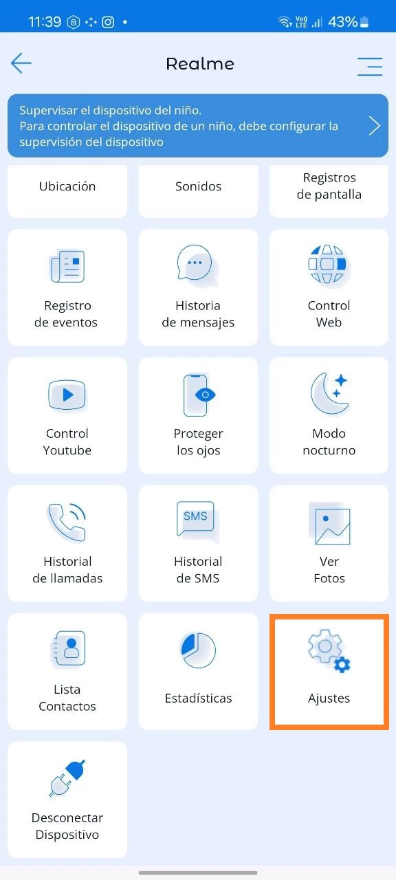 3. Abra la App Kroha para vigilar teléfonos móviles en el dispositivo de los padres -> Seleccione el dispositivo del niño en la lista de dispositivos -> Seleccione 'Configuración' en el menú de la aplicación.