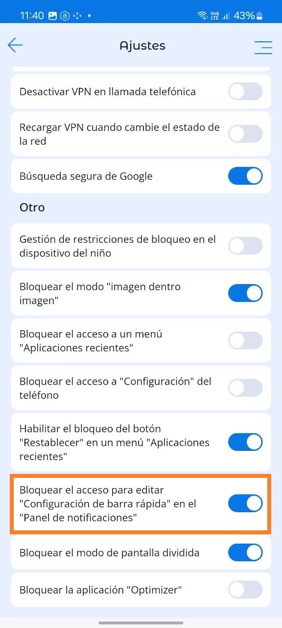 4. Active la configuración 'Bloquear acceso para editar el panel de configuraciones rápidas' en el menú del Panel de Notificaciones.
