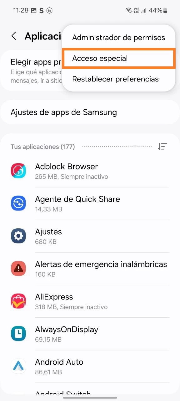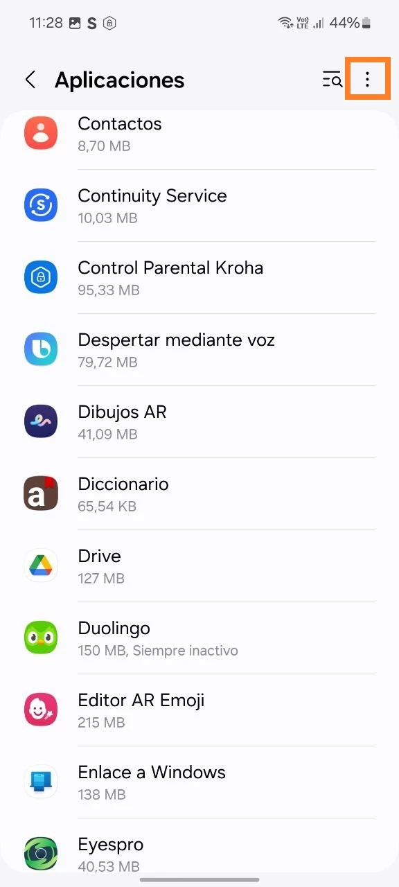 - Abra la aplicación de Configuración en el dispositivo de su hijo > Abra la sección Aplicaciones > Toque el ícono de menú (tres puntos verticales) en la esquina superior de la pantalla > Seleccione Derechos de acceso especial > Vaya a Optimizar consumo de batería > Encuentre App de control parental Kroha en la lista y apague el interruptor (no optimizar);