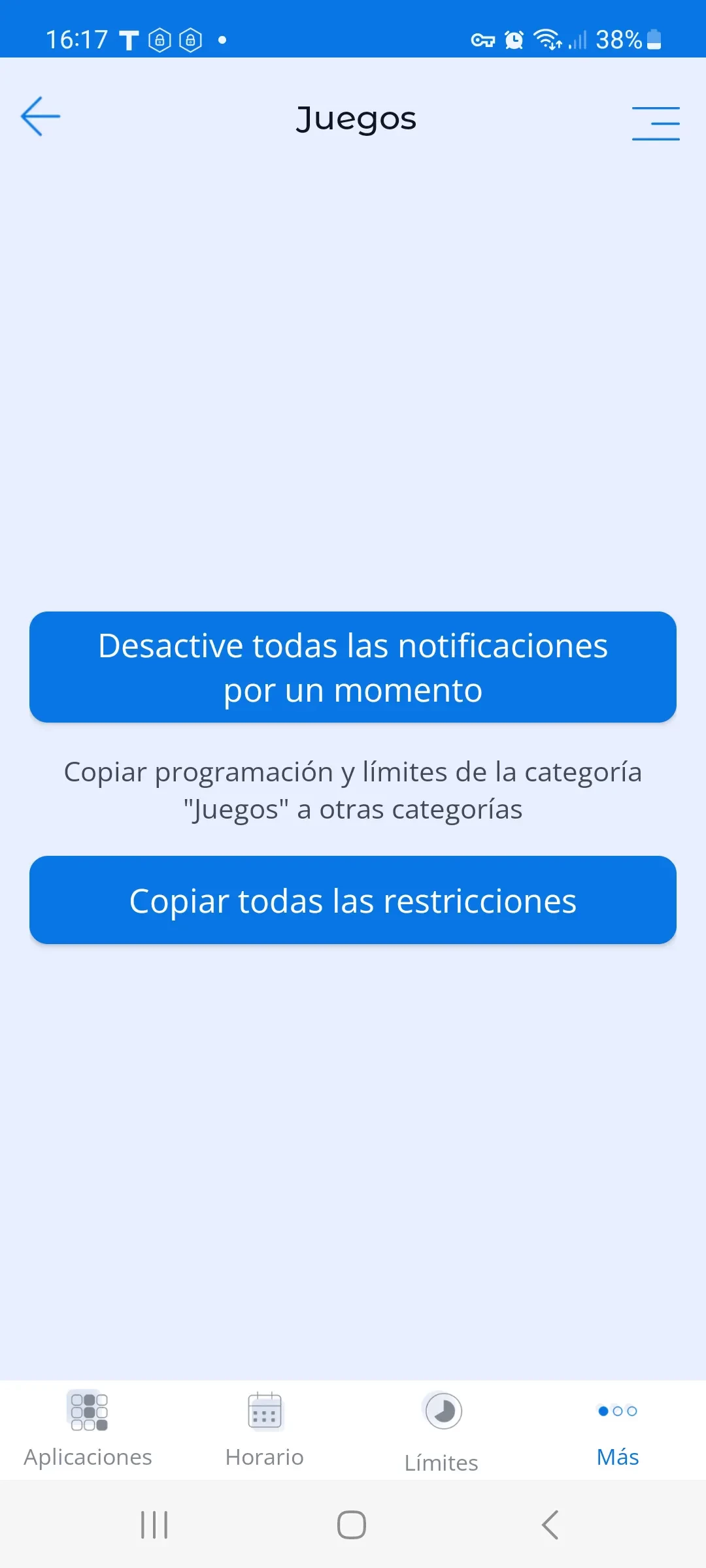 Si el límite se ha agotado y los padres desean agregar algo de tiempo de juego para el niño, al presionar la opción "Deshabilitar todos los límites de tiempo" en el menú adicional "Más" puedes deshabilitar los bloqueos por cualquier período. Para una fácil personalización, en el mismo menú, también puedes duplicar los límites establecidos a otras categorías.