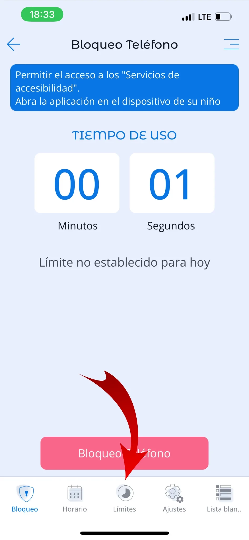 La función “Límites” de la Aplicación de control parental Kroha se encuentra en la sección “Bloqueo de teléfono”. Con esta función, los padres establecen un límite diario de tiempo de pantalla para juegos y aplicaciones.