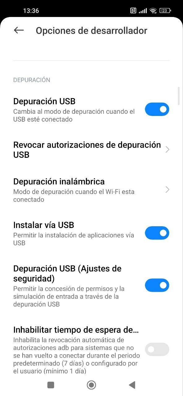 Ten en cuenta que en algunos dispositivos, además del interruptor “Depuración por USB”, hay interruptores “Configuración por USB” y “Depuración por USB (configuración de seguridad)” en las opciones de desarrollador. Si encuentras estos interruptores en el dispositivo de tu hijo, actívalos.