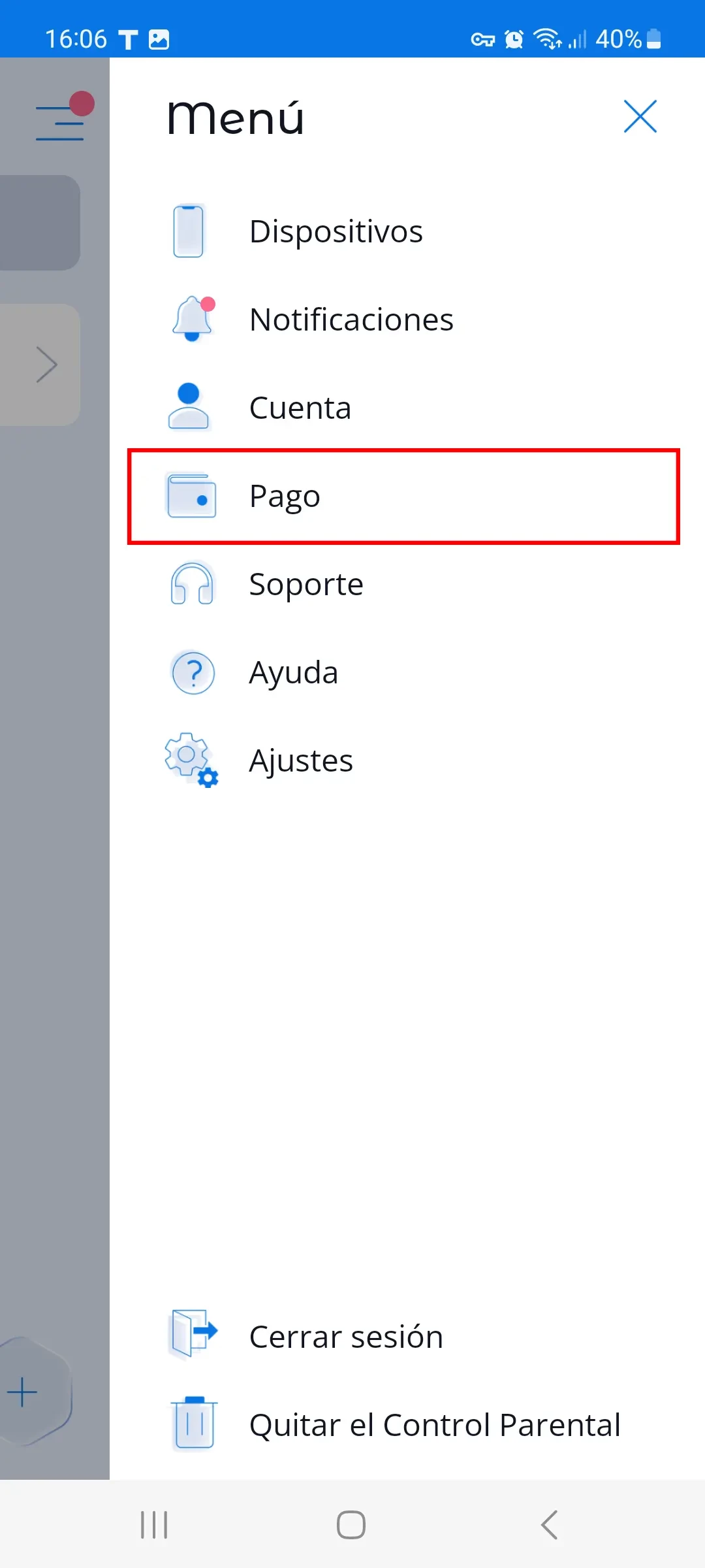 - Hacer clic en el ícono de menú en la esquina superior derecha y acceder al menú de Pago;