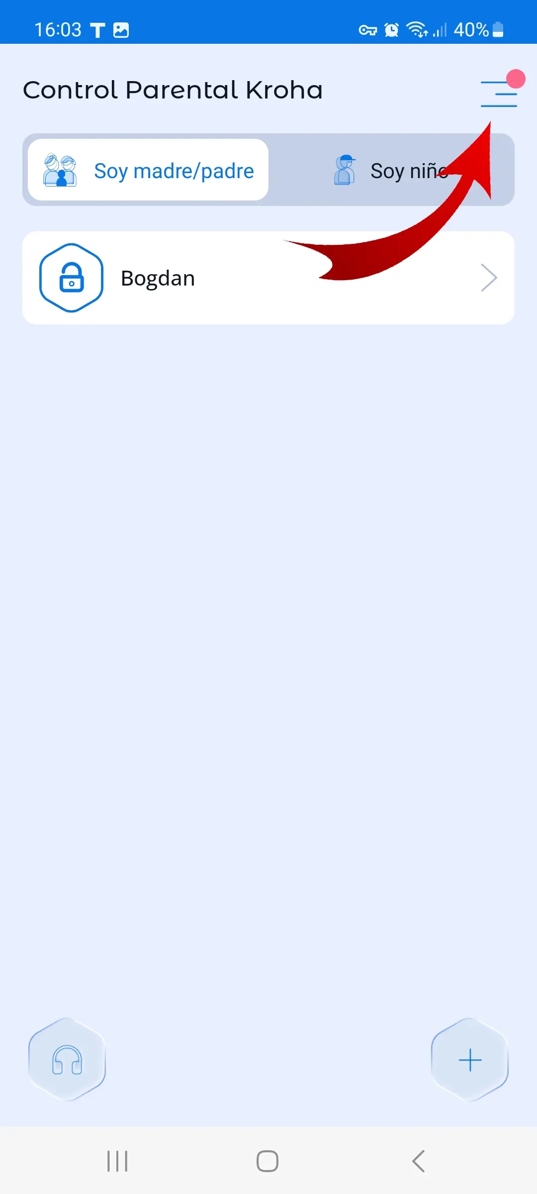 - Abrir la aplicación de control parental Kroha;