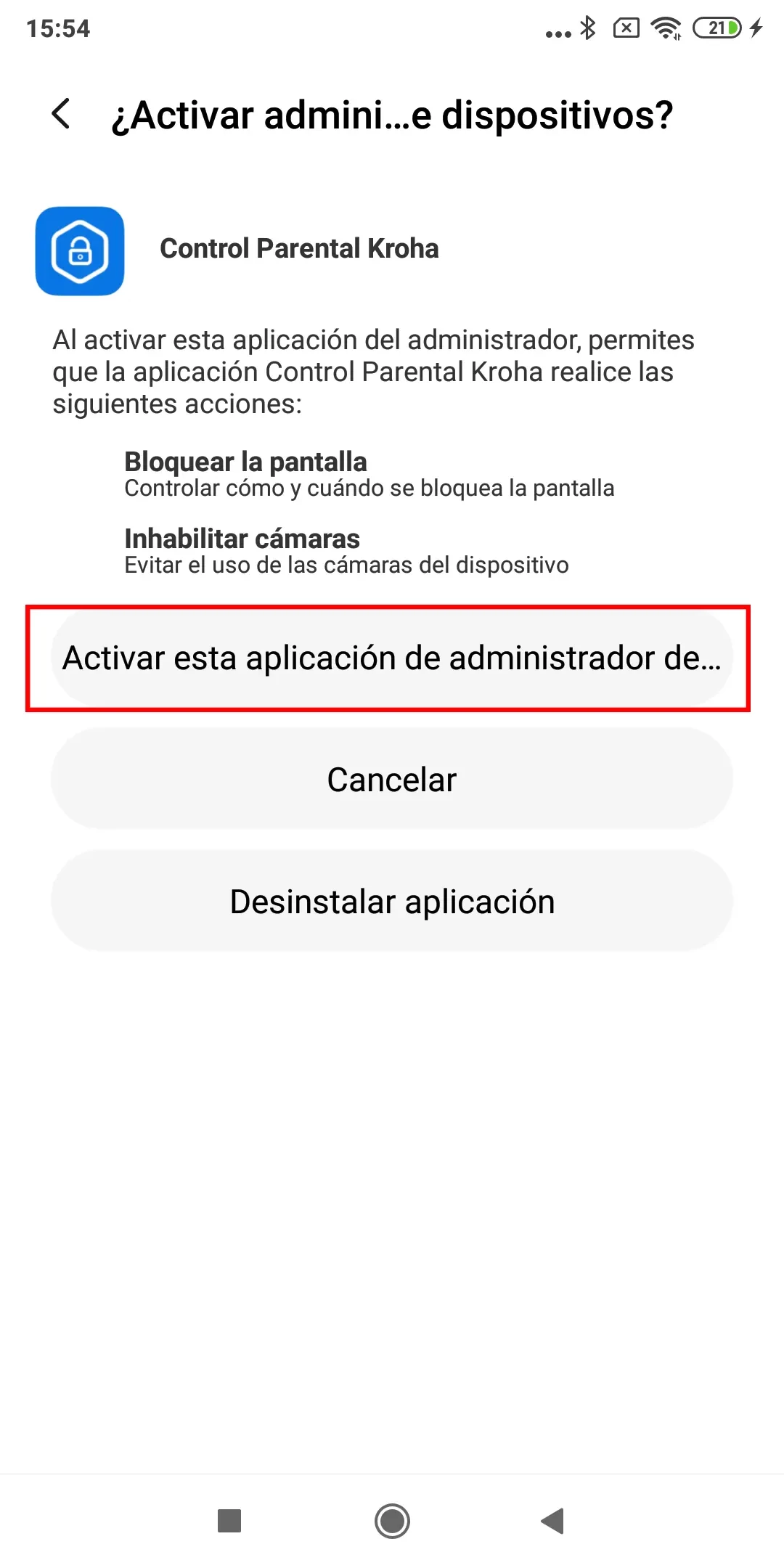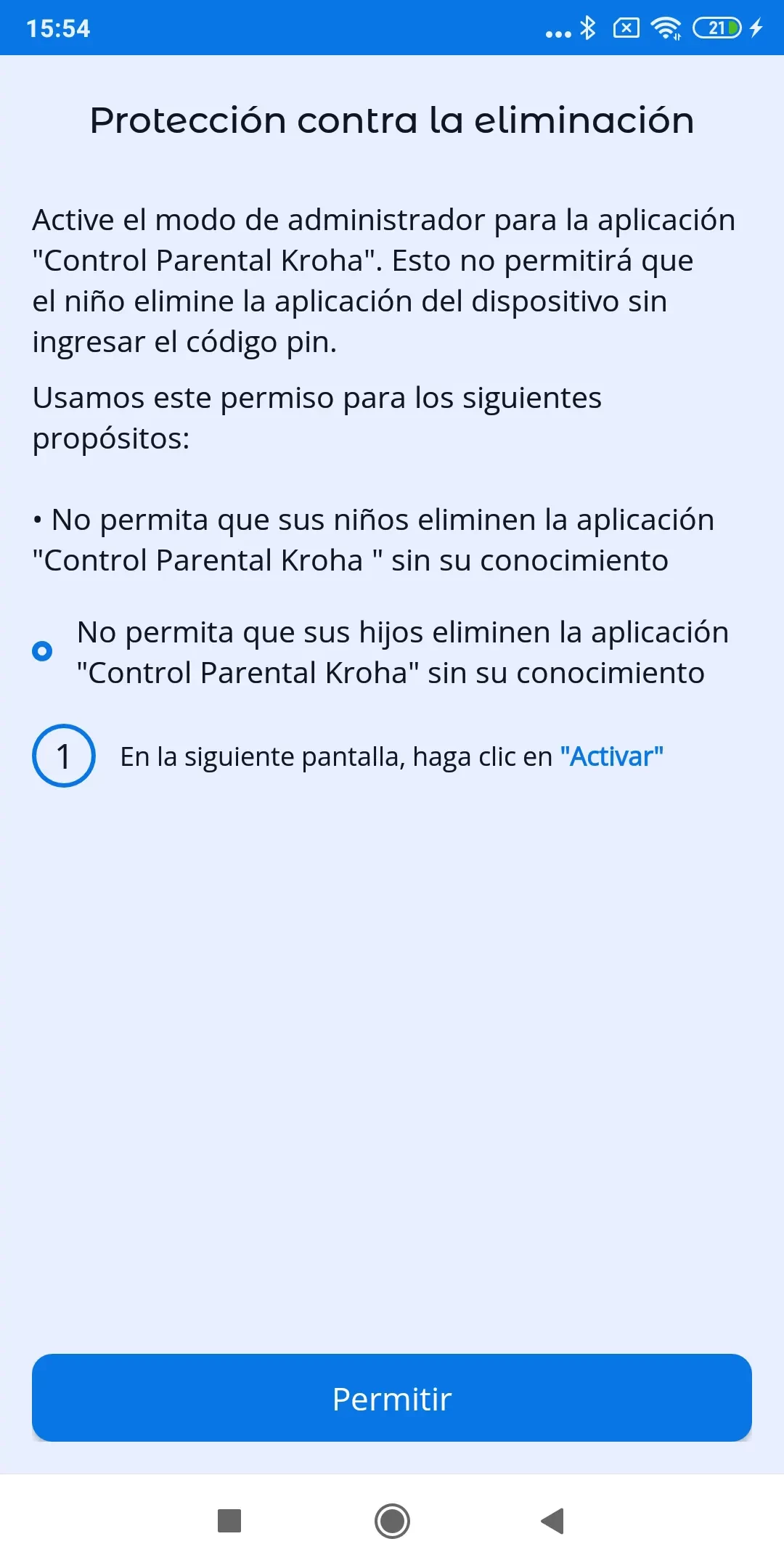 “Protección contra desinstalación”: active el modo administrador para la aplicación de control parental Kroha. Esto evitará que su hijo elimine la aplicación del dispositivo sin ingresar el código PIN, lea la guía paso a paso para más detalles y toque “Permitir”;