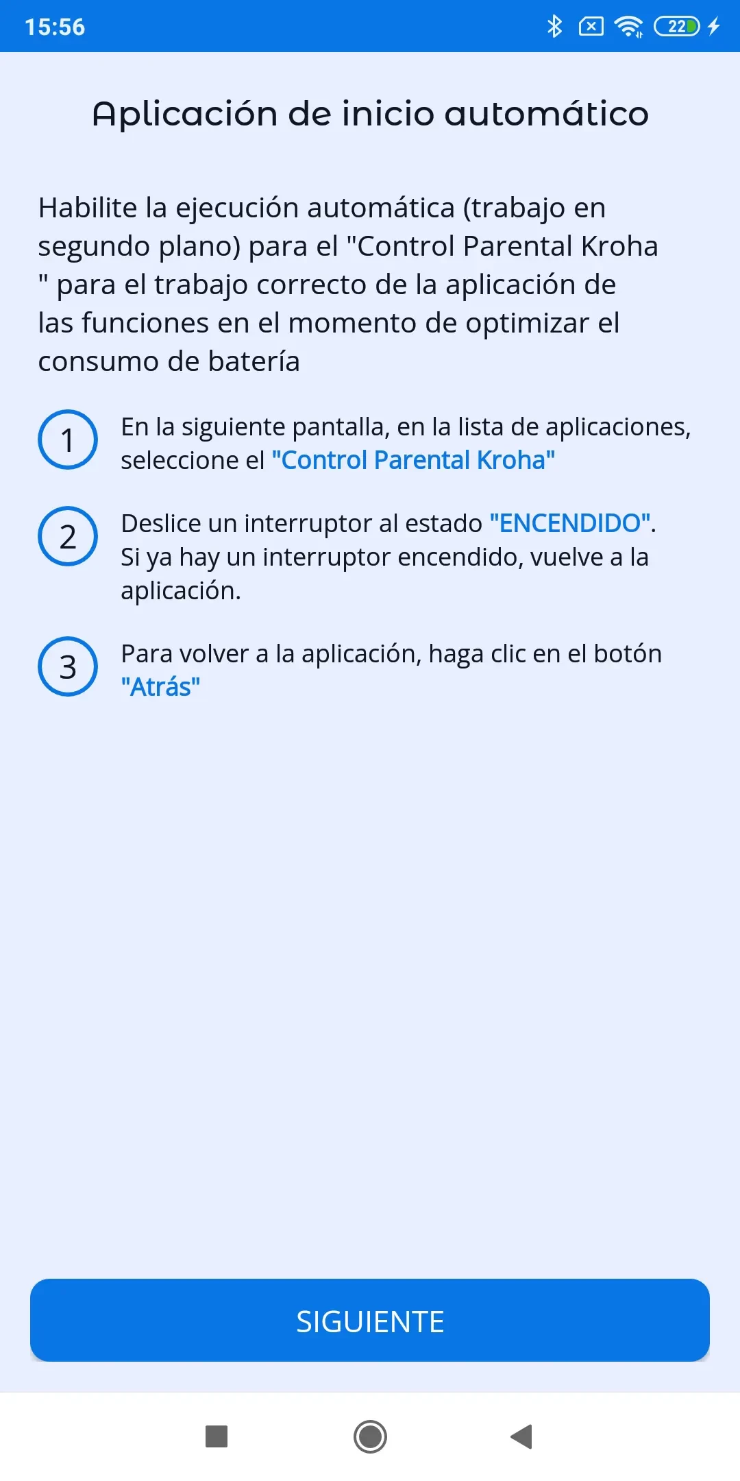 ¡Importante! El servicio de “Inicio automático” y “Optimización de batería” no opera en todos los smartphones. Se recomienda seguir todos los pasos en las instrucciones. En caso de que “Inicio automático” esté desactivado, la aplicación puede ser suspendida automáticamente por el sistema Android y puede no poder proporcionar las funciones de la aplicación.