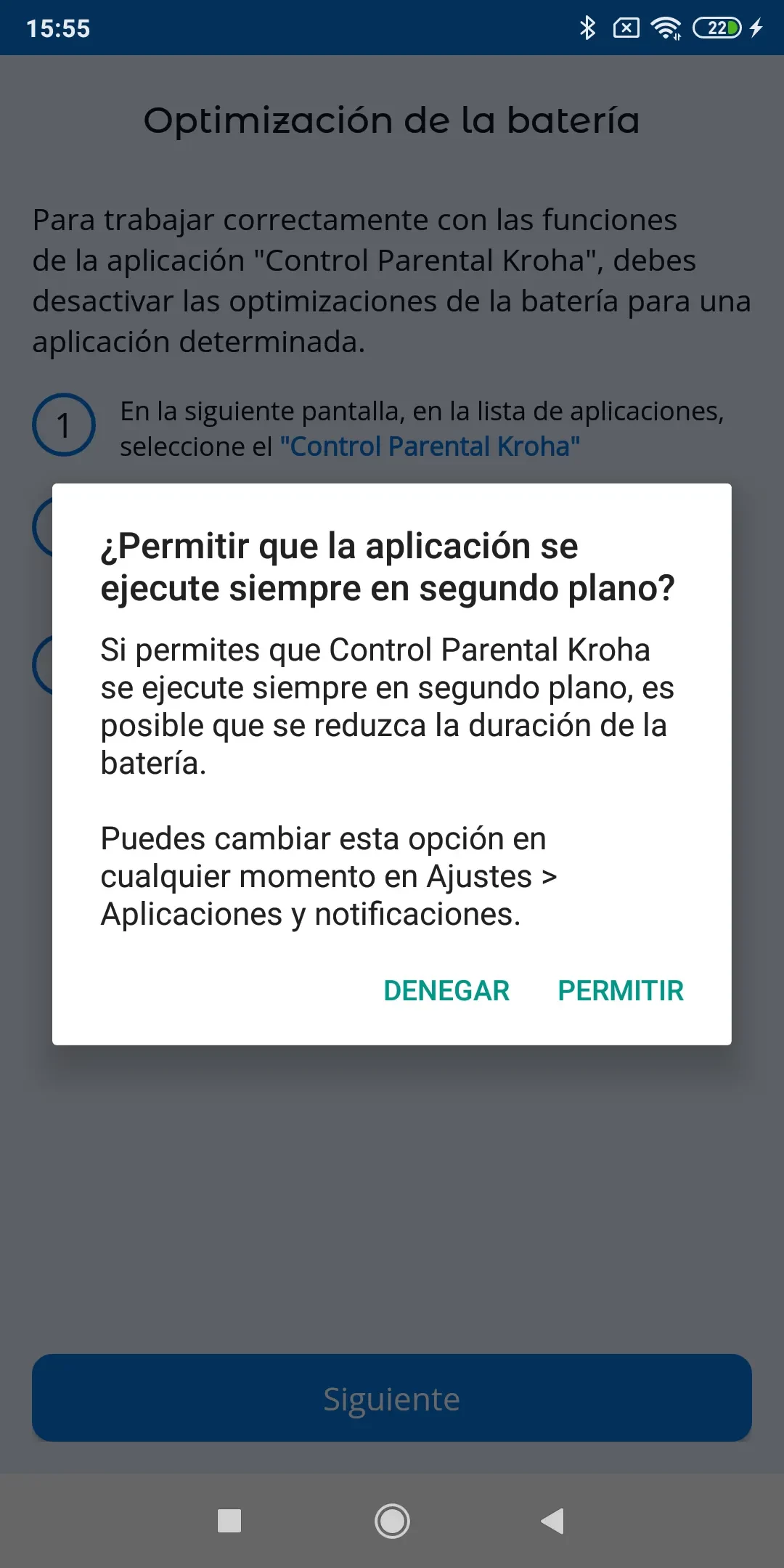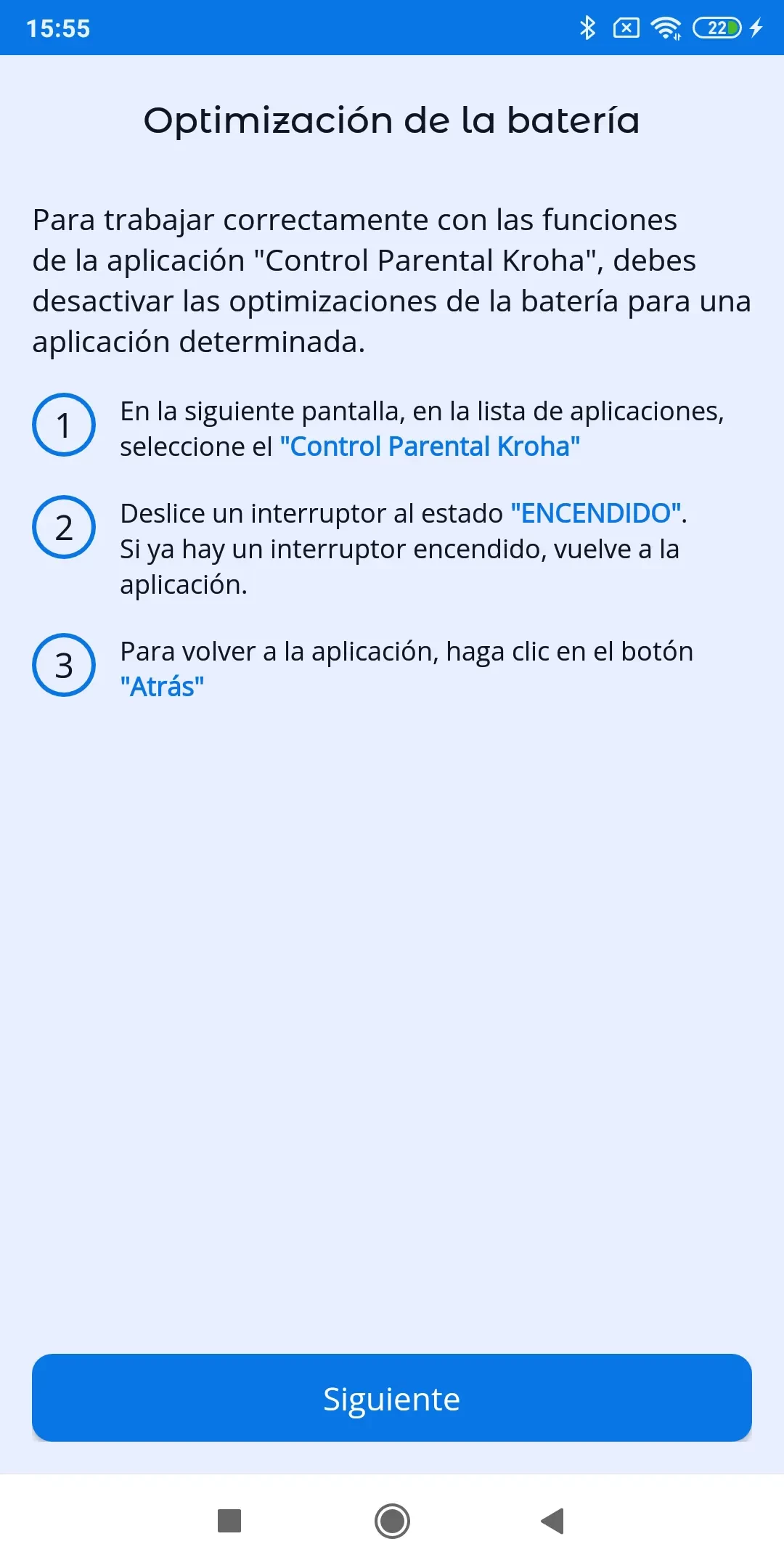 “Optimización de batería”: para el correcto funcionamiento de la aplicación, necesita desactivar la optimización de batería para la aplicación de control parental Kroha, lea la guía paso a paso para más detalles y toque “Siguiente”;