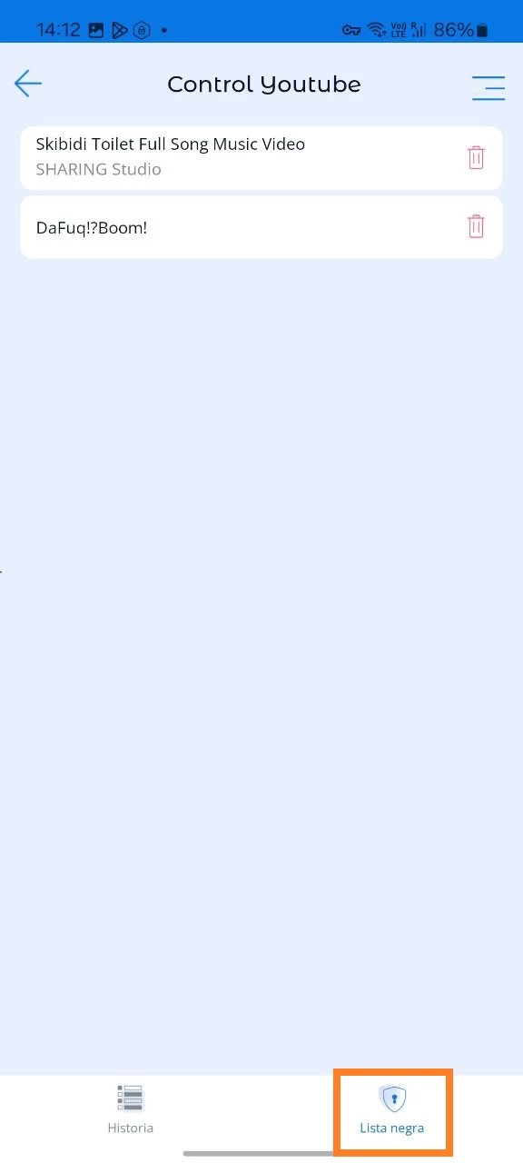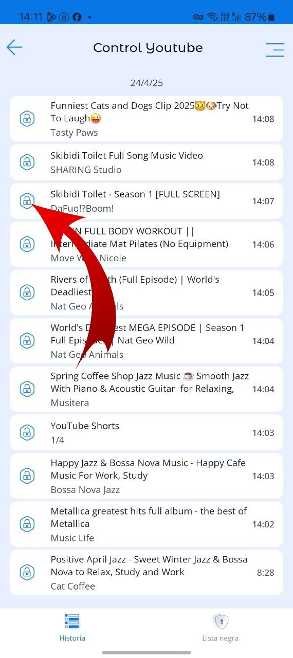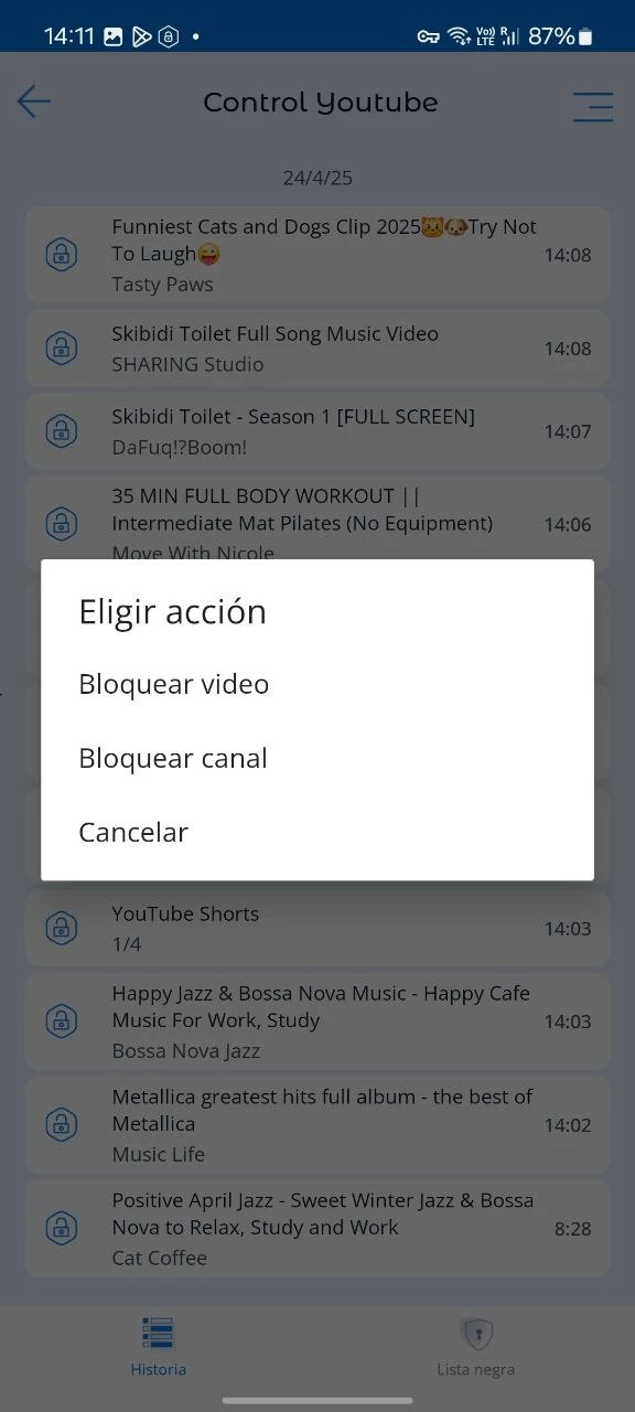 El historial de videos de YouTube vistos por el niño. Bloquear contenido en YouTube o bloquear un canal de YouTube no deseado, opción de crear una lista negra.