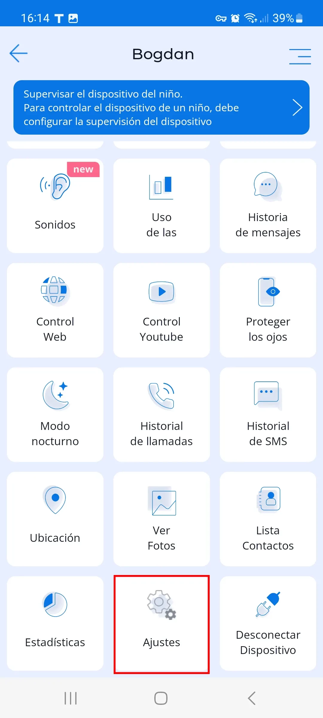 Botón de "Configuración" en el menú principal: la capacidad de cambiar la configuración desde el dispositivo de los padres en el dispositivo seleccionado del niño utilizando la aplicación para controlar a los niños Kroha.