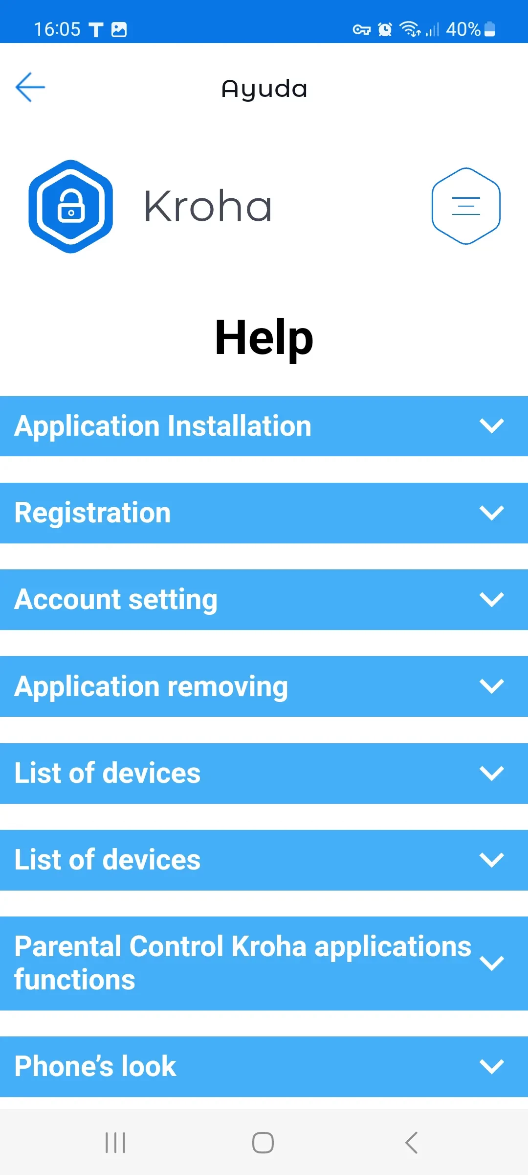 Los usuarios pueden encontrar las siguientes opciones en el menú de la Aplicación de control parental Kroha: