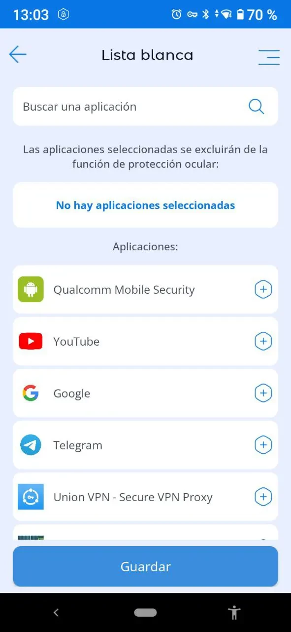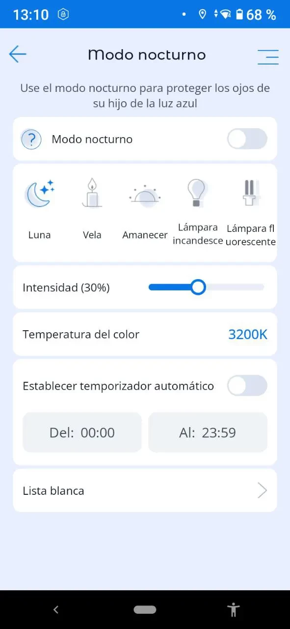 Lista blanca: Si no deseas que la función de modo nocturno funcione para ciertas aplicaciones, puedes agregarlas a una lista blanca y la función de modo nocturno se desactivará cuando se inicien esas aplicaciones.