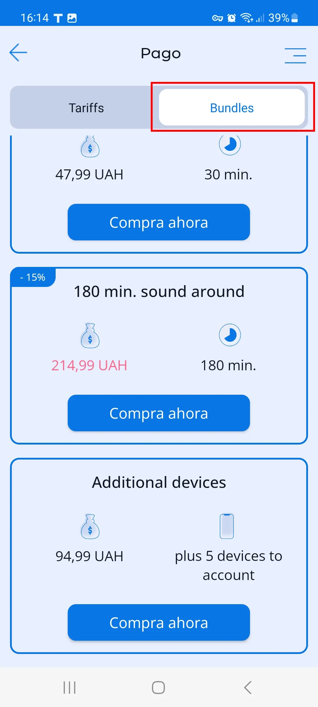 Puede ampliar su cuenta con dispositivos adicionales, comprar paquetes de minutos adicionales para la función "el sonido ambiente" o comprar paquetes adicionales para la función de "Capturas de pantalla". Puede pagar por servicios adicionales en la aplicación Control parental Kroha en la sección "Pago" (pestaña "Paquetes").