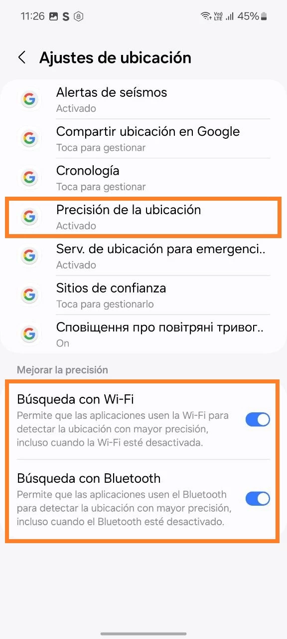 Para obtener geodatos y mejorar la precisión de la recuperación de la ubicación, por favor verifica los siguientes ajustes: