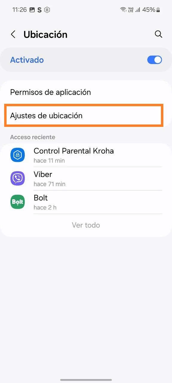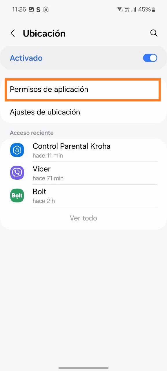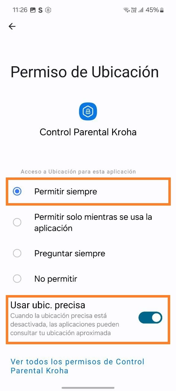 4. Abre la aplicación de Configuración en el dispositivo del niño > Ubicación > Permisos de aplicaciones > Controles parentales Kroha > selecciona “Permitir siempre” y habilita el interruptor “Usar ubicación precisa”.