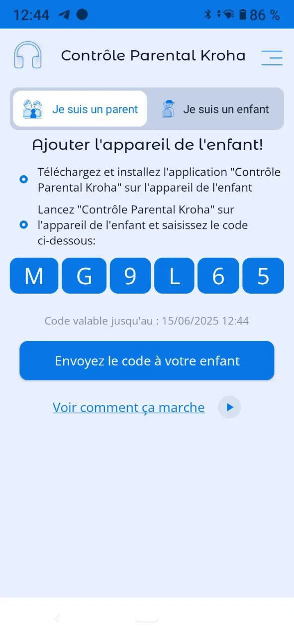 3. Ouvrez l'application Control Parental Kroha sur l'appareil de votre enfant et entrez le code.
