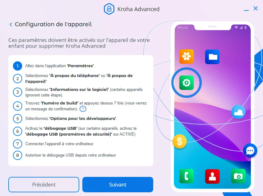 Si vous avez installé Kroha application avancée de contrôle parental sur l'appareil de votre enfant, utilisez les instructions suivantes pour désinstaller l'application :