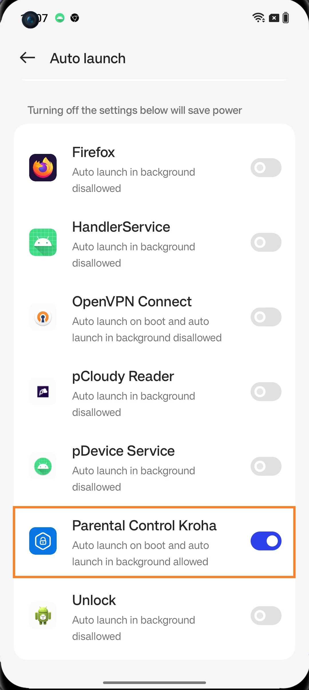 - Ouvrez les Paramètres sur l'appareil de votre enfant > Allez dans Applications > Puis Auto lancement > Application de contrôle parental Kroha > Activez (Autorun est activé lorsqu'il est allumé et en arrière-plan).