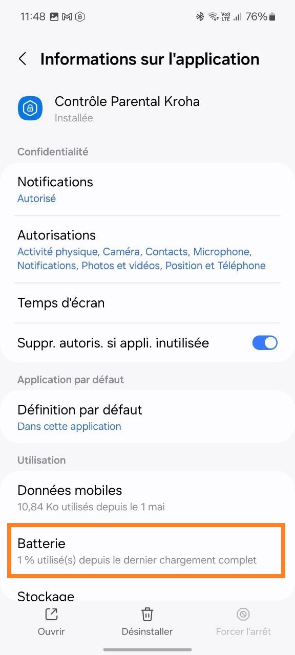 Comment faire fonctionner l'Application Kroha de contrôle parental en arrière-plan sur Samsung (Android 12 - 14) ?