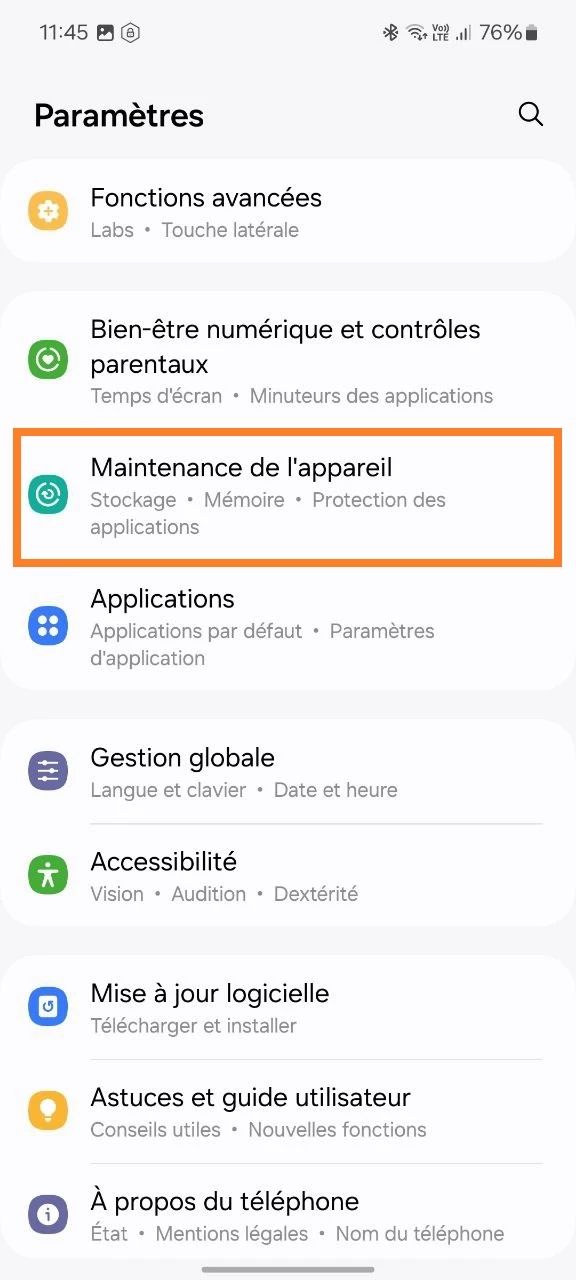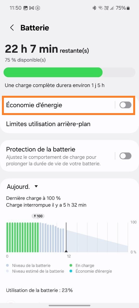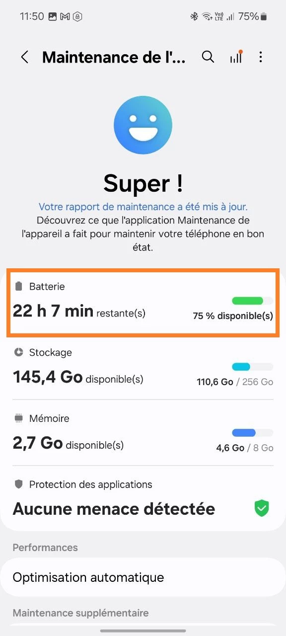 - Ouvrez les Paramètres sur l'appareil de votre enfant > Entretien de l'appareil > Batterie > Économie d'énergie > Désactiver.