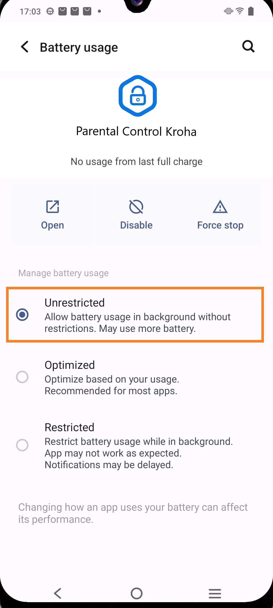 - Allez dans "Paramètres" sur l'appareil de votre enfant > "Batterie" > "Gestion de l'alimentation en arrière-plan" > Trouvez l'application de contrôle parental Kroha > Sélectionnez "Ne pas restreindre."