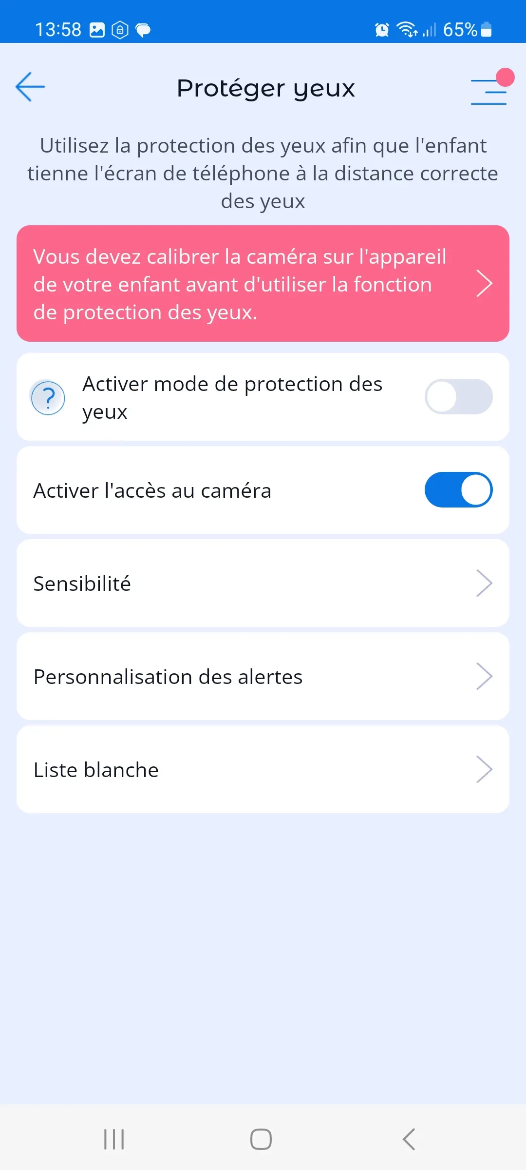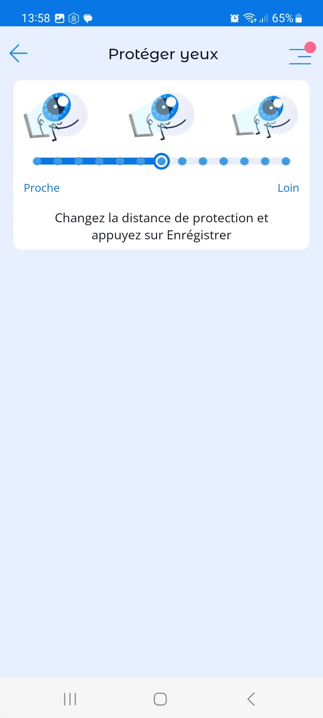 - Activer la vibration lorsque la distance entre les yeux et l’écran est trop proche.