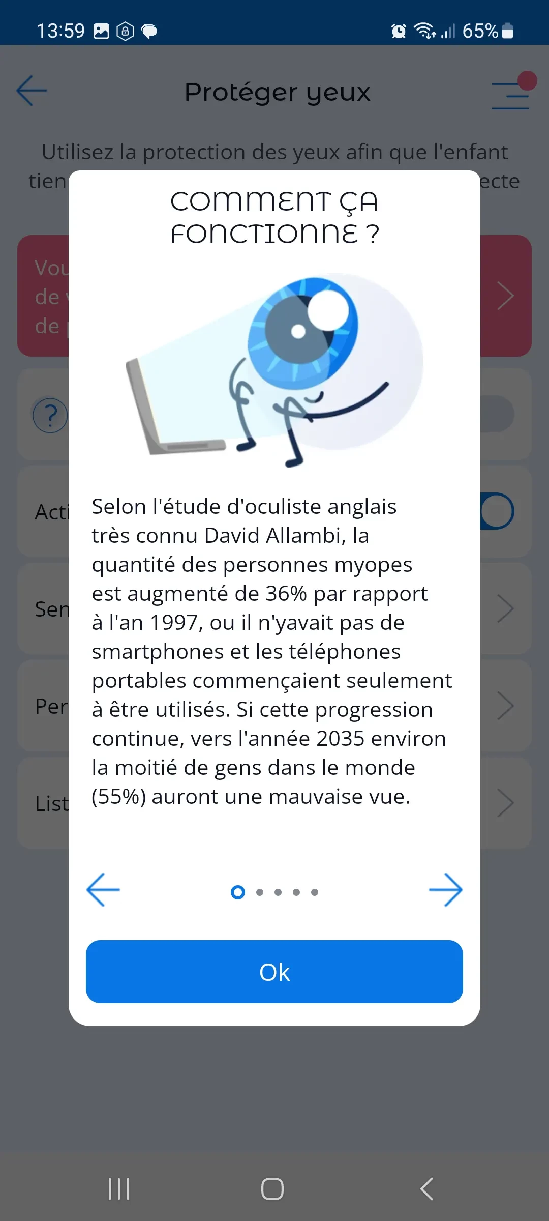 Les utilisateurs peuvent cliquer sur le point d'interrogation à côté de l'interrupteur d'activation de la fonctionnalité pour en savoir plus sur les problèmes et les recommandations des ophtalmologistes.