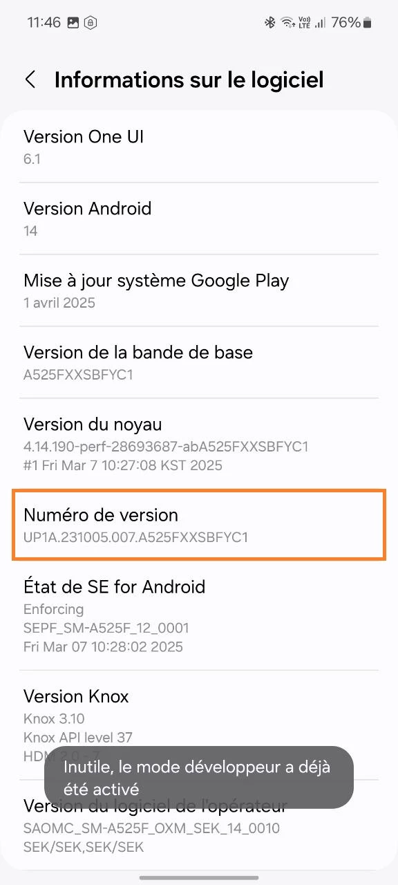 - Trouvez l'élément « Numéro de build » et cliquez dessus 5 à 8 fois;