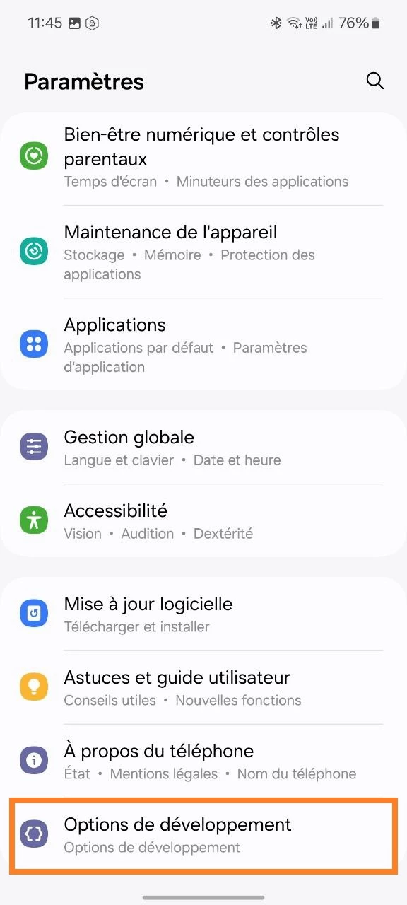- La section « Options de développeur » apparaîtra en bas, cliquez dessus.