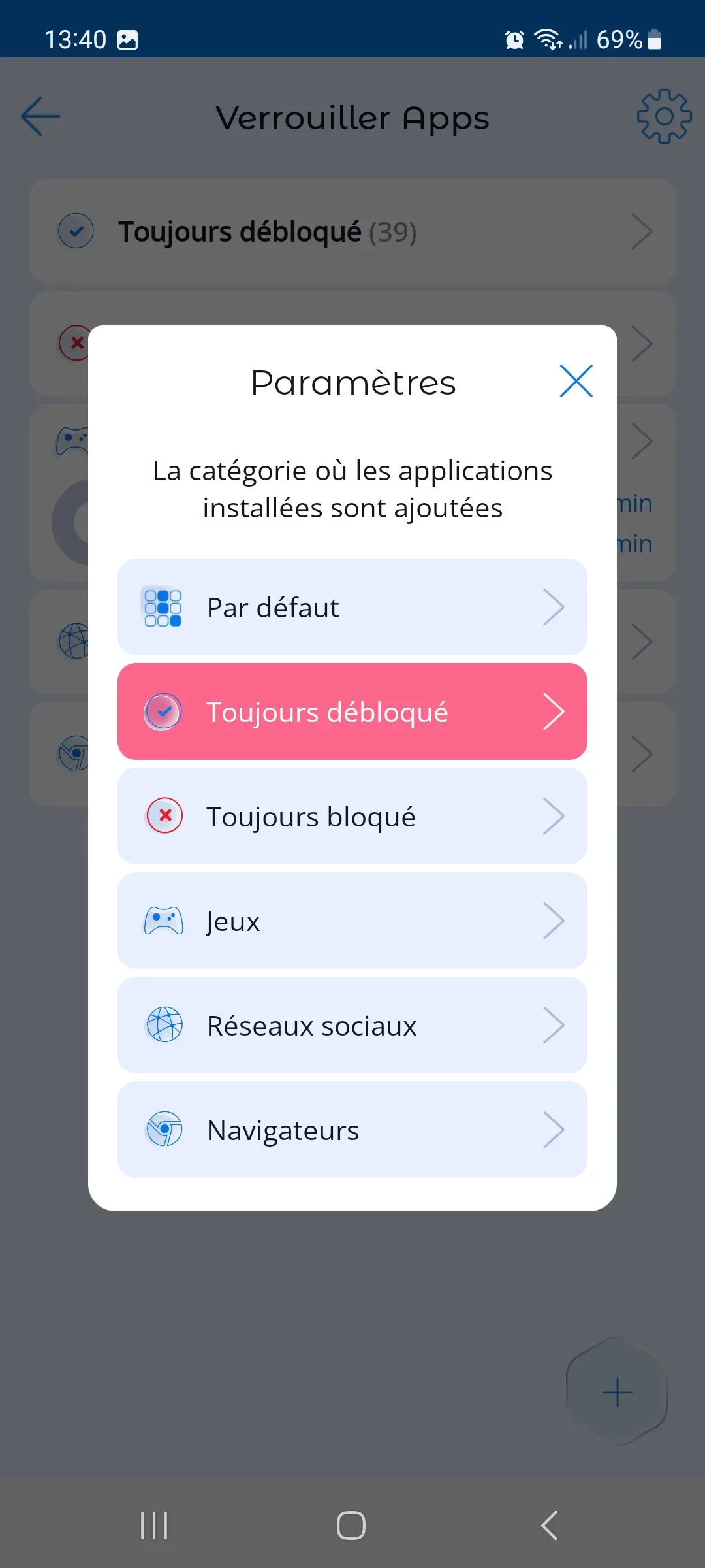 Par exemple, si les parents souhaitent bloquer les nouvelles applications, le paramètre « Toujours bloqué » doit être activé. Dans ce cas, l'application sera verrouillée jusqu'à ce que le parent la déplace vers une autre catégorie.