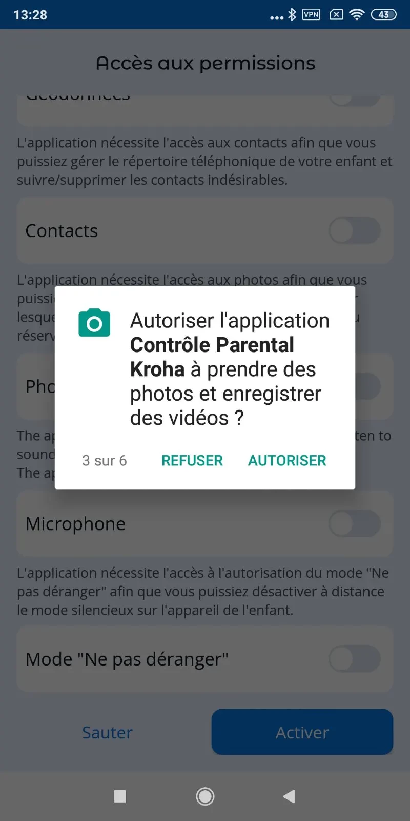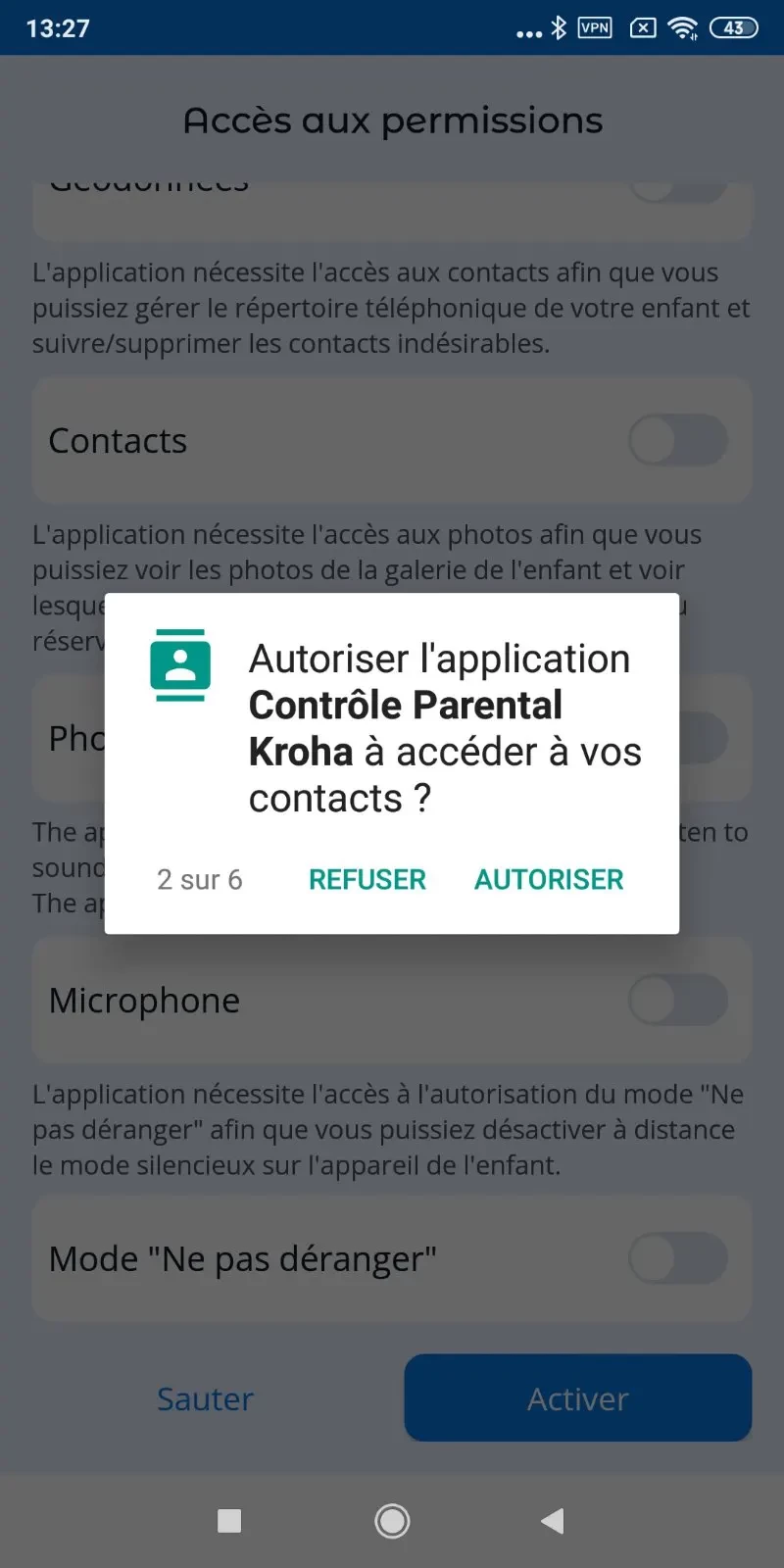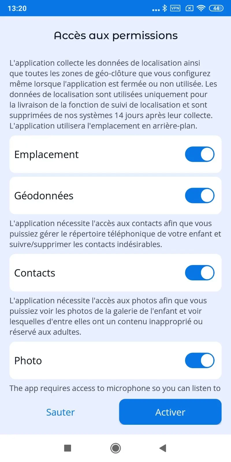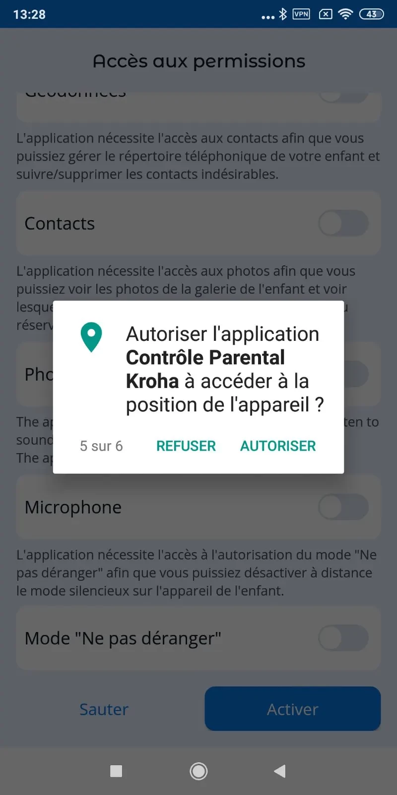 Pour que l'application fonctionne correctement, vous devez définir les autorisations lors de la connexion de l'appareil de votre enfant à votre compte.