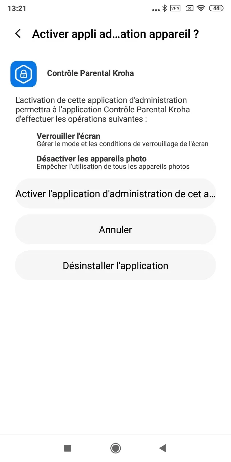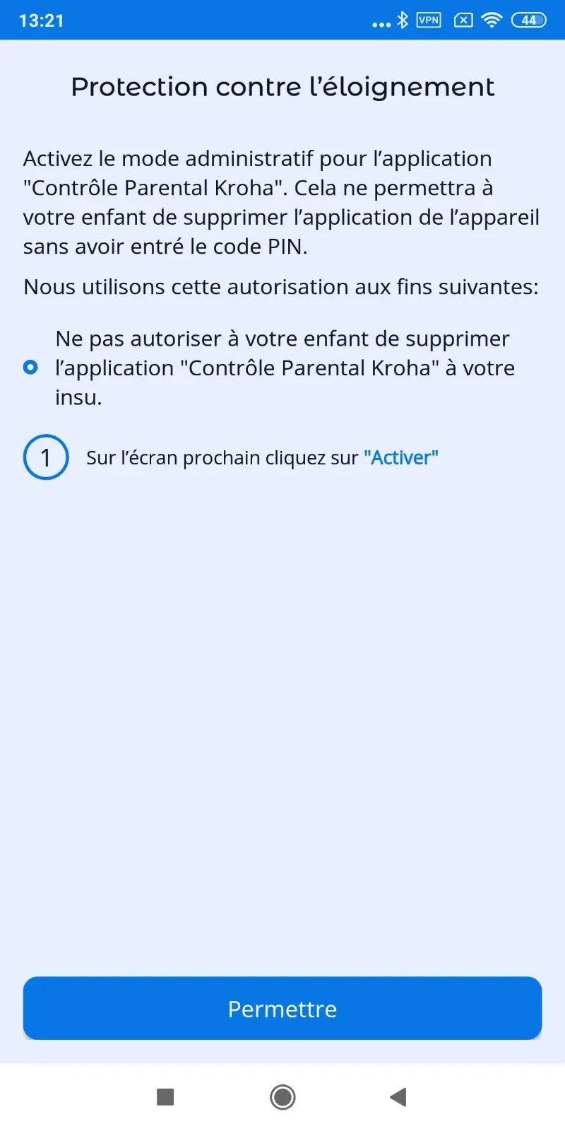“Protection contre la désinstallation” : activez le mode administrateur pour l'application de contrôle parental Kroha. Cela empêchera votre enfant de supprimer l'application de l'appareil sans entrer le code PIN, lisez le guide étape par étape pour plus de détails et appuyez sur “Autoriser” ;