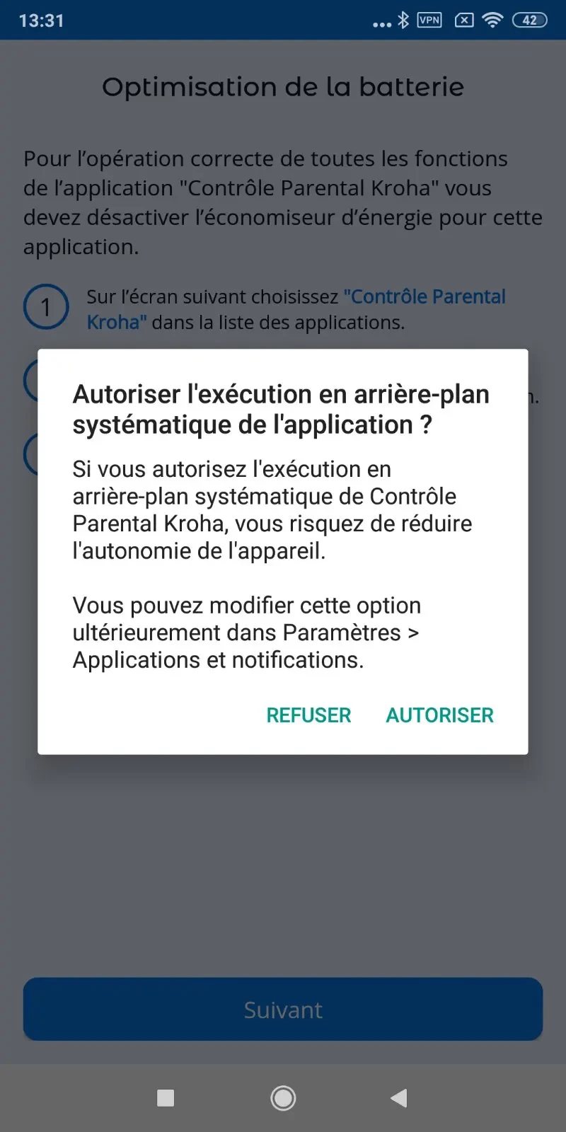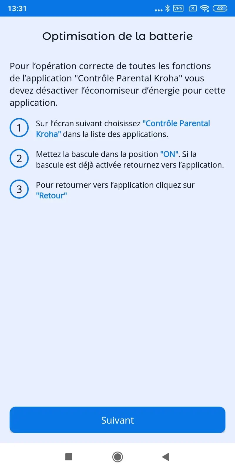 “Optimisation de la batterie” : pour le bon fonctionnement de l'application, vous devez désactiver l'optimisation de la batterie pour l'application de contrôle parental Kroha, lisez le guide étape par étape pour plus de détails et appuyez sur “Suivant” ;