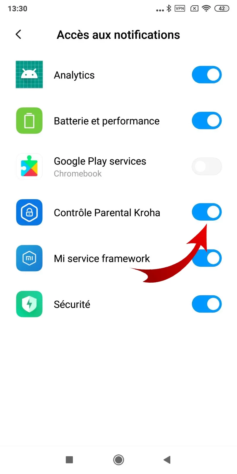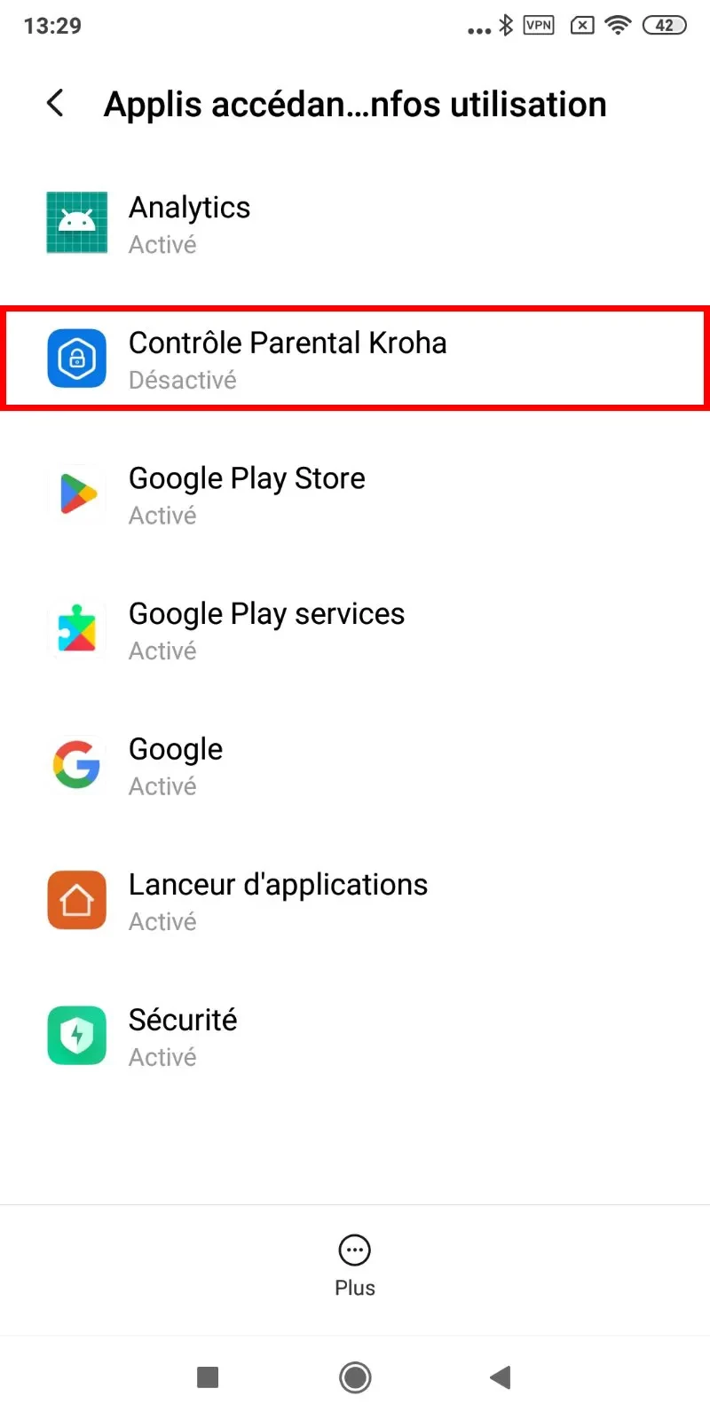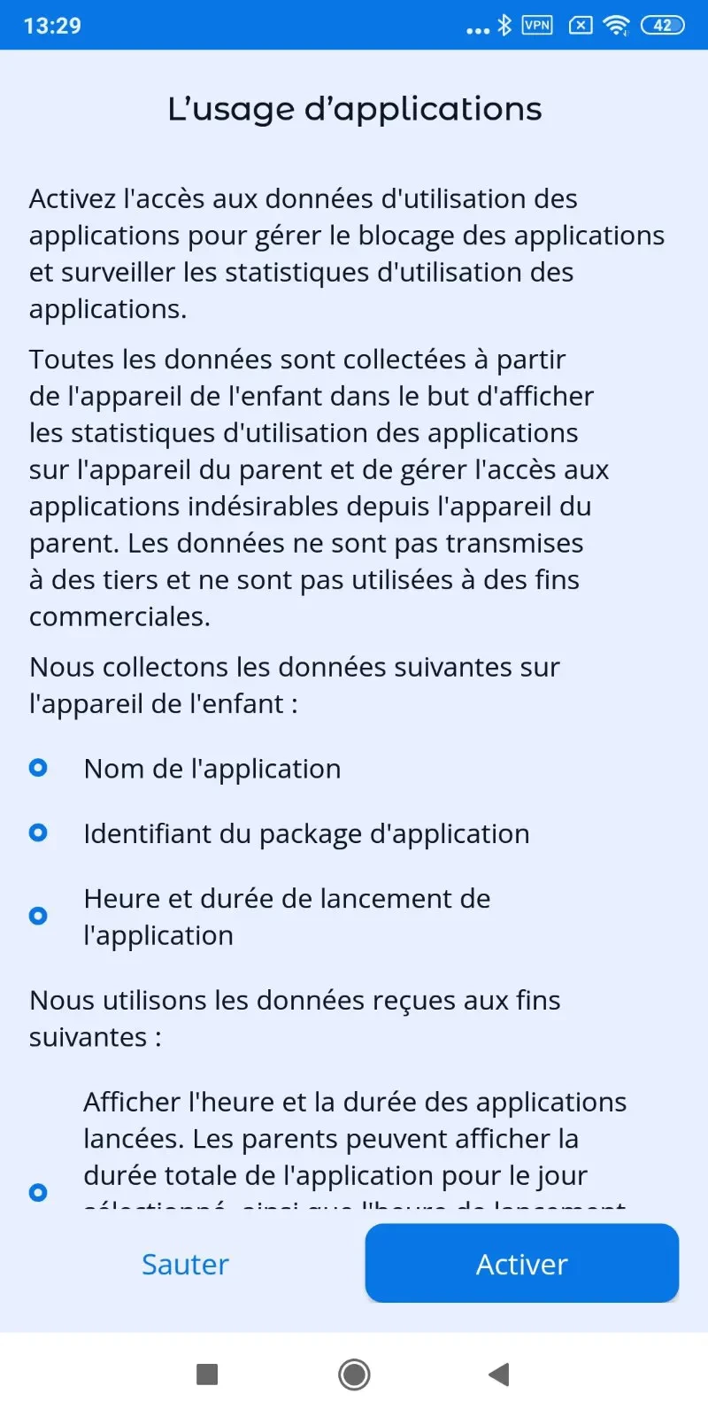 “Utilisation des applications” : activez l'accès aux données d'utilisation des applications, pour que l'application de contrôle parental Kroha fonctionne correctement, lisez le guide étape par étape pour plus de détails et appuyez sur “Activer” ;