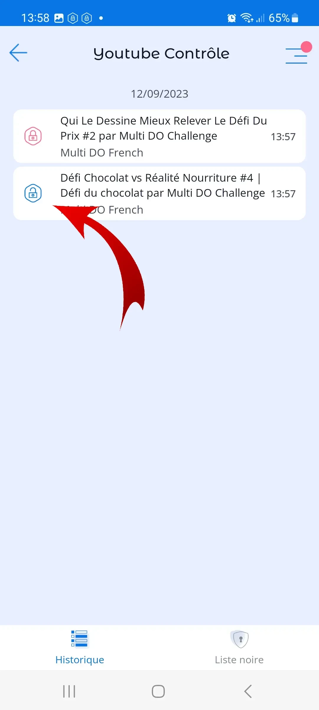 L'historique des vidéos YouTube visionnées par l'enfant. Bloquer du contenu sur YouTube ou bloquer une chaîne YouTube indésirable, l'option de créer une liste noire.
