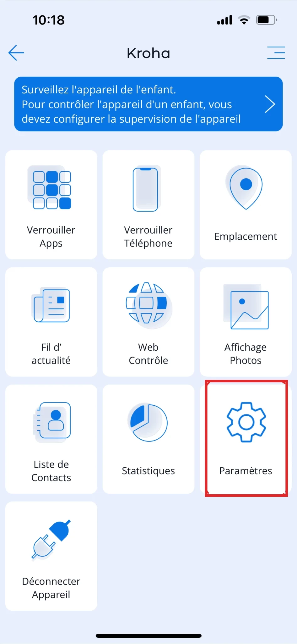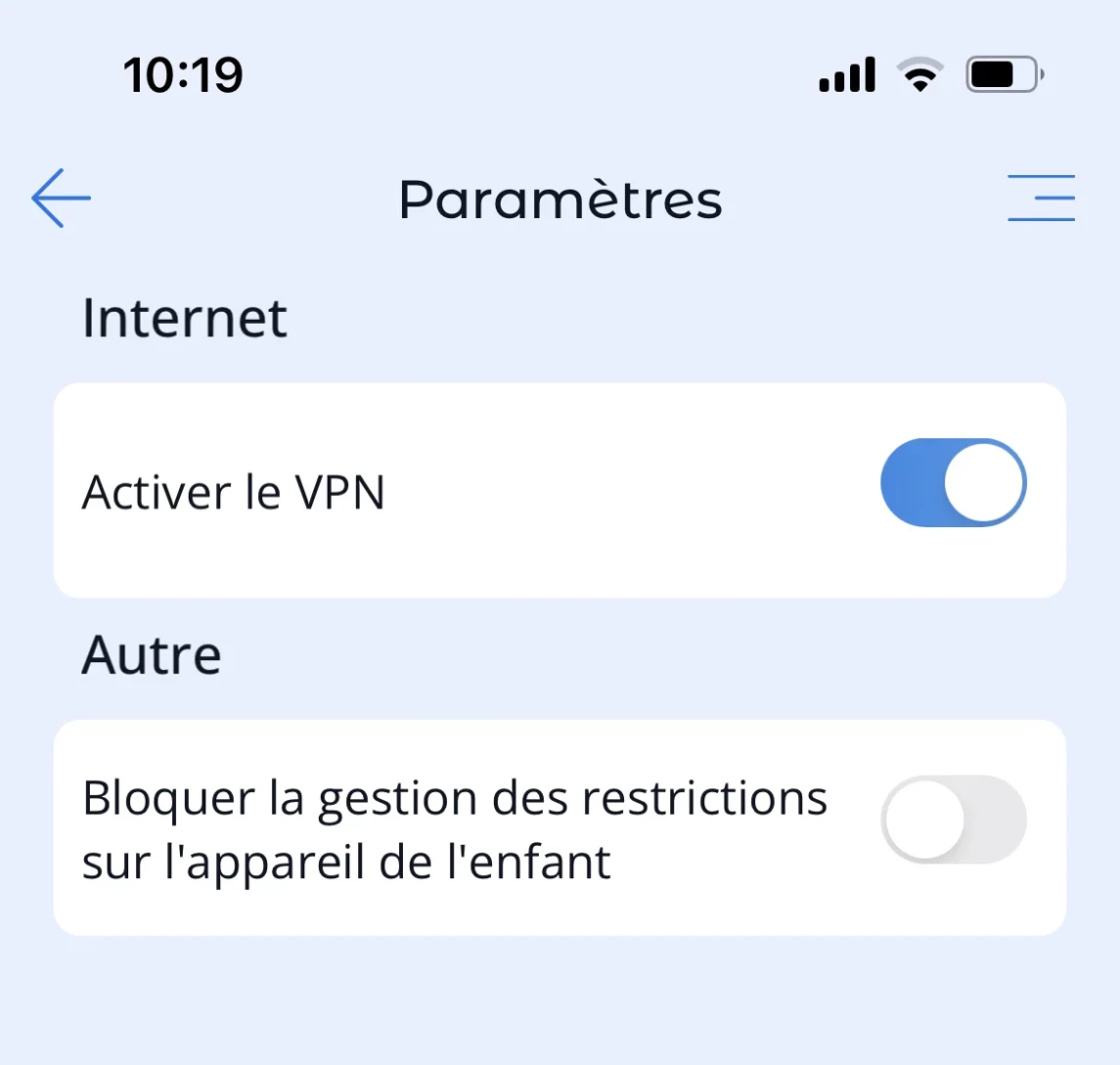 Dans "Paramètres", les parents ont la possibilité d'activer "Internet sécurisé" et "Verrouiller la gestion des restrictions sur l'appareil".
