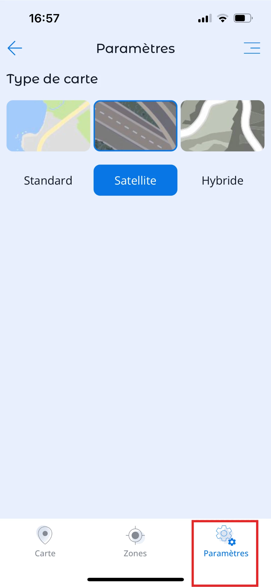 Ici, vous pouvez changer le type d'affichage de la carte. Les modes suivants sont disponibles : "Standard", "Satellite", "Hybride".