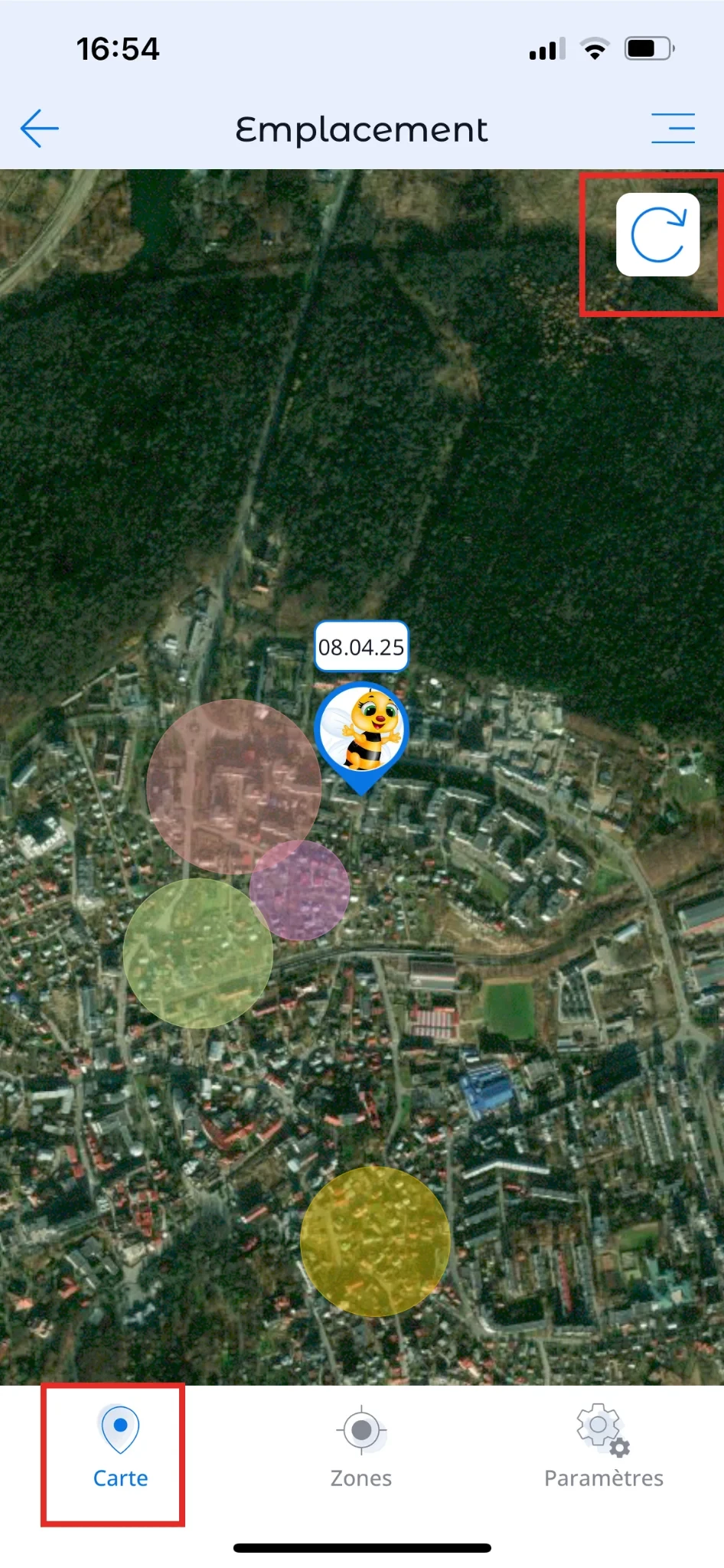 La localisation actuelle de l'appareil de l'enfant est affichée ici. Au-dessus du pointeur (épingle) que vous voyez sur la carte, vous pouvez voir la date et l'heure de la dernière coordonnée reçue de l'appareil de l'enfant. Si la coordonnée a été reçue il y a longtemps et n'est plus pertinente, cliquez sur "Actualiser" dans le coin supérieur droit.