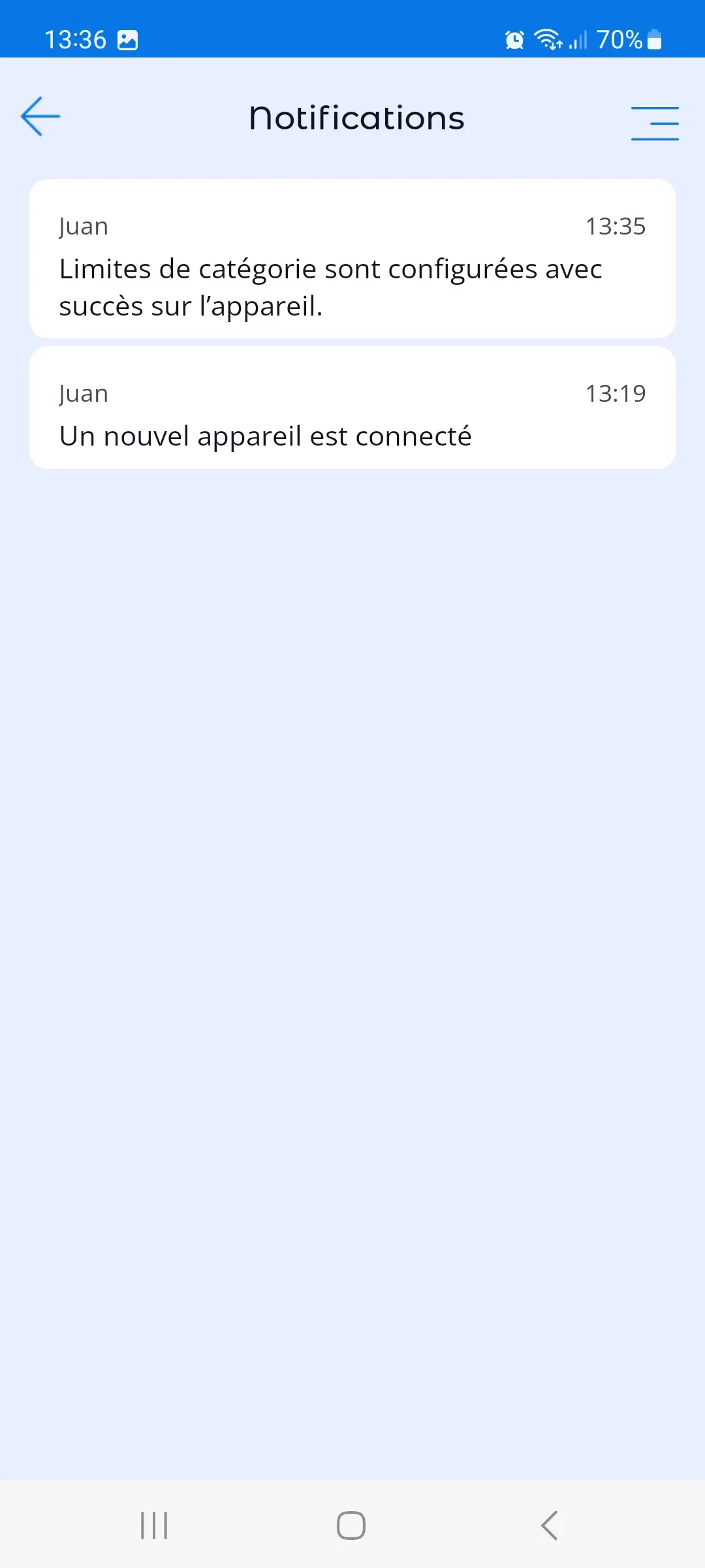 2. Notifications. Ici, vous trouvez des notifications importantes concernant les événements sur le téléphone de votre enfant (sortie de la zone géographique, installation de nouvelles applications, désactivation des permissions critiques de l'application).