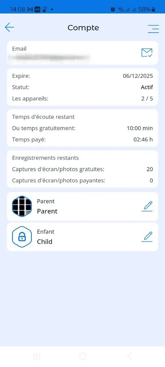 1. Appareils. Sélectionner cet élément du menu amène l'utilisateur à l'écran principal de l'application avec une liste des appareils des enfants surveillés.
