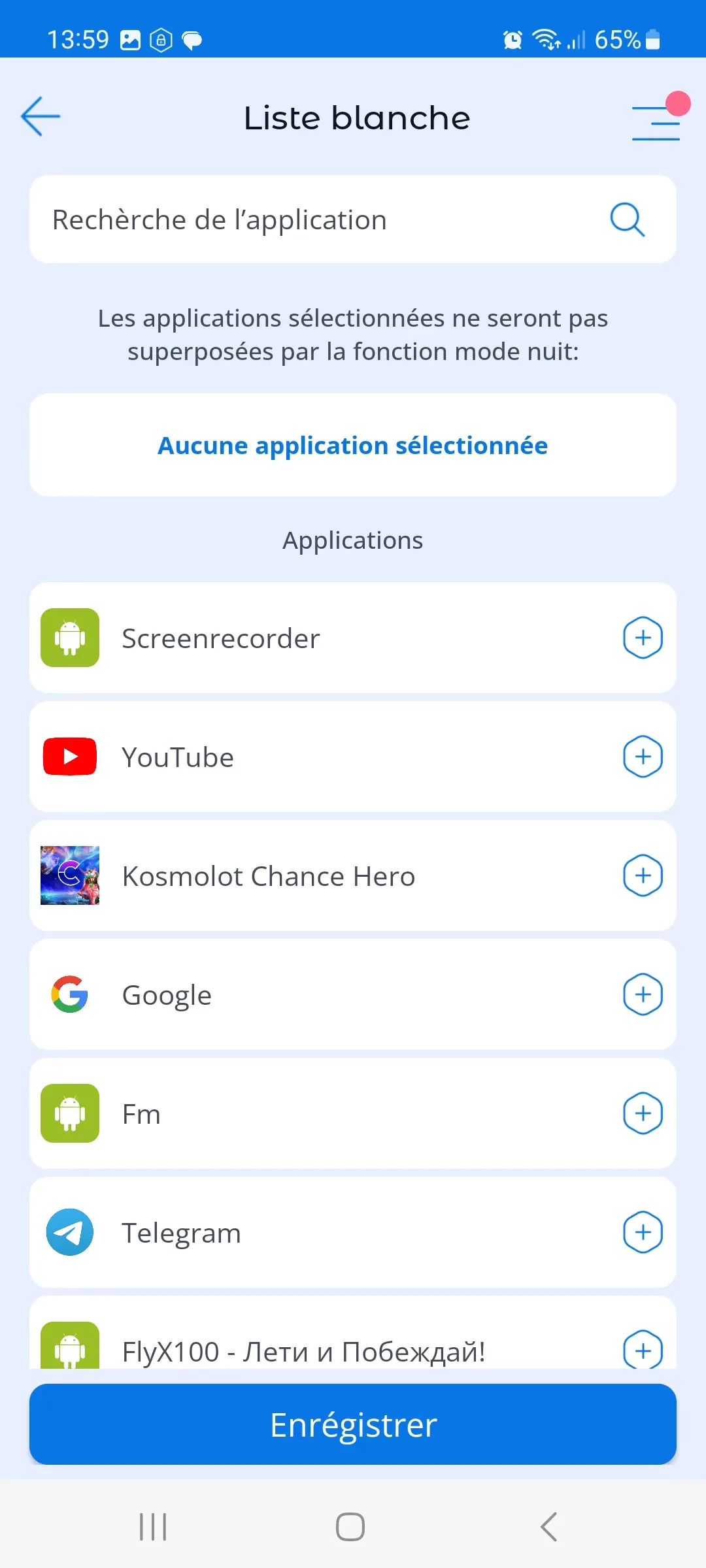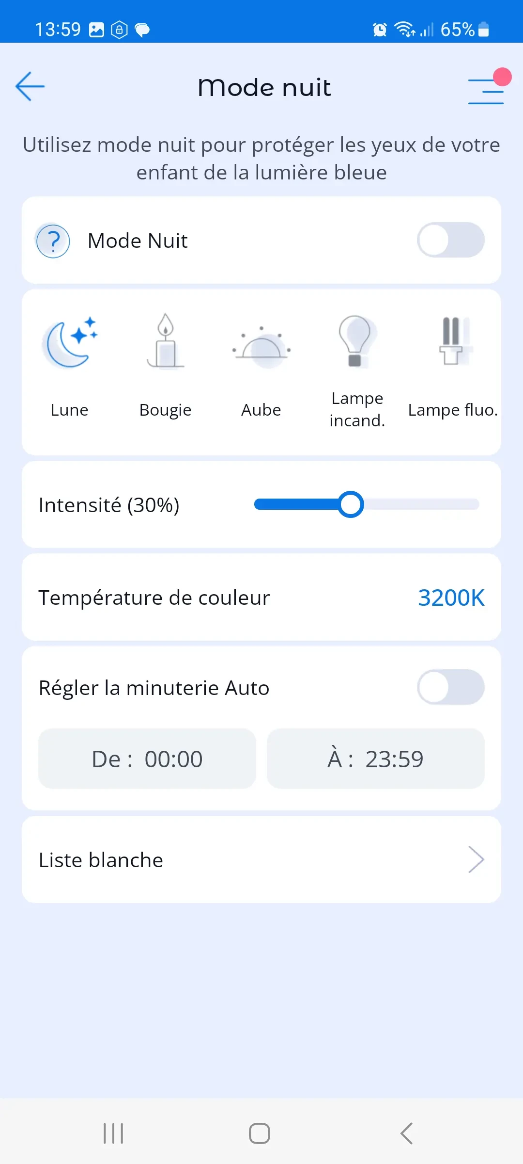 Sécurité oculaire: Si vous ne souhaitez pas que la fonctionnalité Mode nuit du téléphone portable fonctionne pour certaines applications, vous pouvez les ajouter à une liste blanche et la fonctionnalité Mode nuit sera désactivée lorsque ces applications seront lancées.