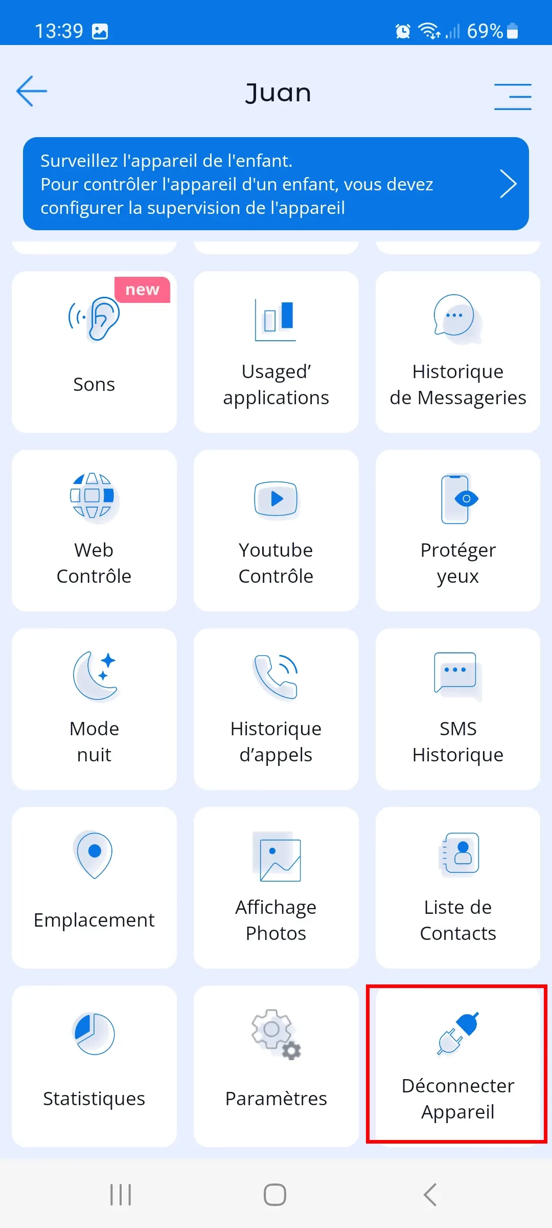 Si nécessaire, il est possible de déconnecter un certain appareil de votre compte dans l'Aplicación de control parental Kroha, et toutes les données précédemment reçues concernant cet appareil seront sauvegardées sur le serveur.