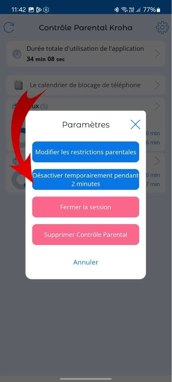 Nous bloquons l'accès aux paramètres afin d'empêcher un enfant de désinstaller l'Application de contrôle parental Kroha de son smartphone ou de modifier, par exemple, la date et l'heure pour contourner les restrictions.